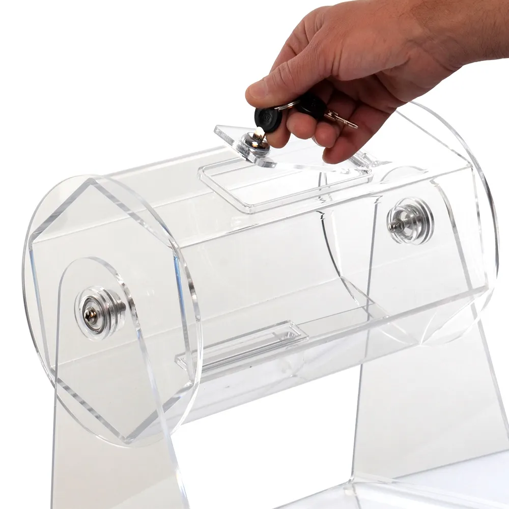 This ticket drum is used at corporate events, retail stores, trade shows, and even in schools or at birthday parties to create a fun atmosphere with giveaways! The included raffle barrel is made from 5mm thick clear acrylic, offering a clear view of items inside to give confidence to participants that the drawing is being run properly. The 310mm long barrel has a 8 x 10mm slot in the side to easily insert raffle tickets, names on a paper, and other items to be drawn for prizes. A sliding bar keeps items from falling out, with a knob to easily offer access. There is a locking hinged door on one side as well to make removing entries simple whilst preventing tampering.