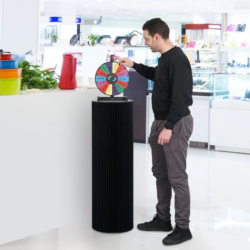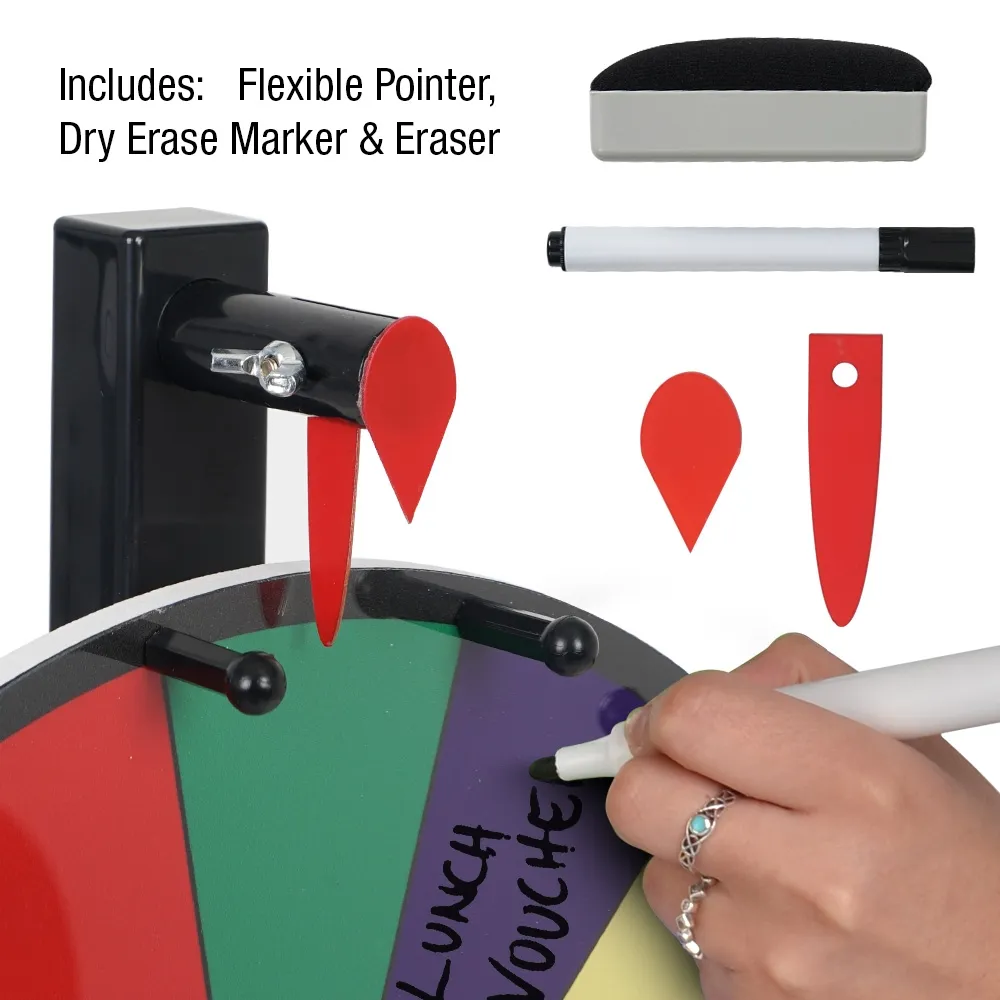 Use this raffle wheel at community events, trade shows, retail stores, schools, markets, and employee gatherings to generate excitement and interest! This display features 14 individual slots that are in different colours to allow heaps of prizes to be displayed on a wheel that is eye-catching whilst spinning. There is dry erase marker and eraser included to make writing different prizes on the wheel easy. The 30cm diameter wheel includes a flexible pointer that generates noise whilst the wheel is spinning against the protruding pegs between each slot that really draw attention in any room. The centre of the wheel says “Spin to Win” and has colourful angled arrows that create a great effect whilst the wheel is spinning!