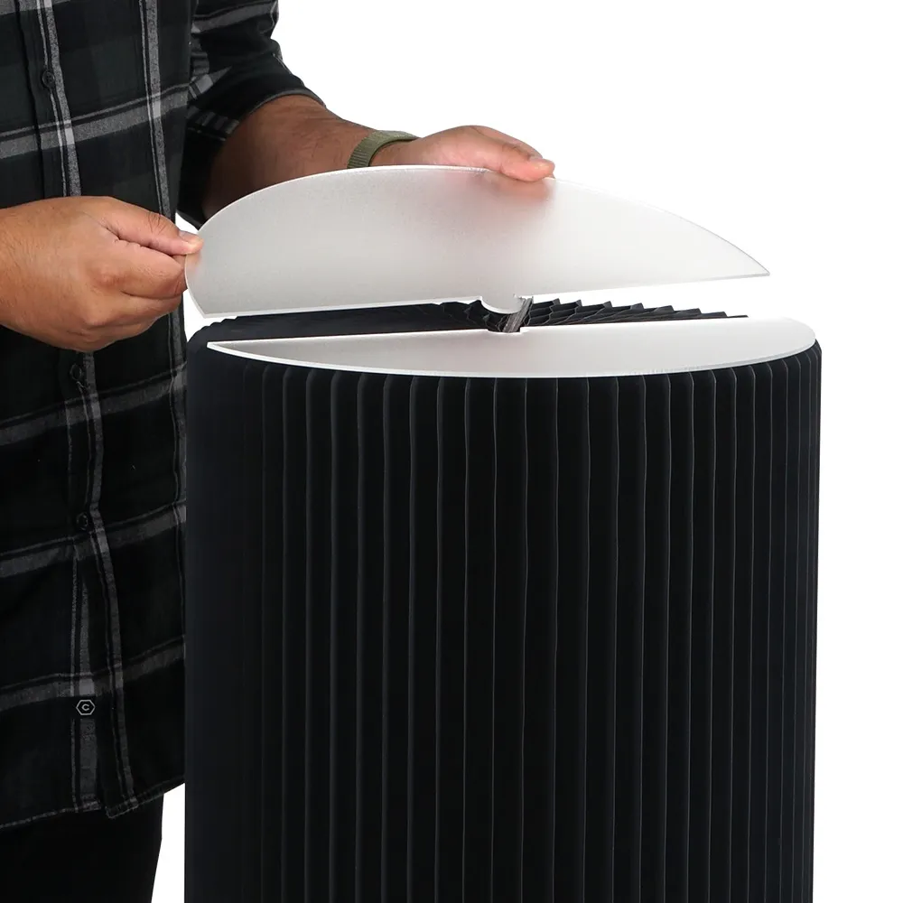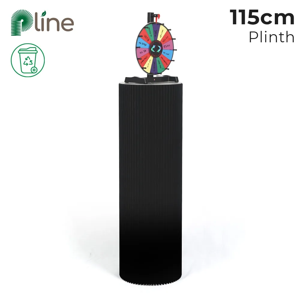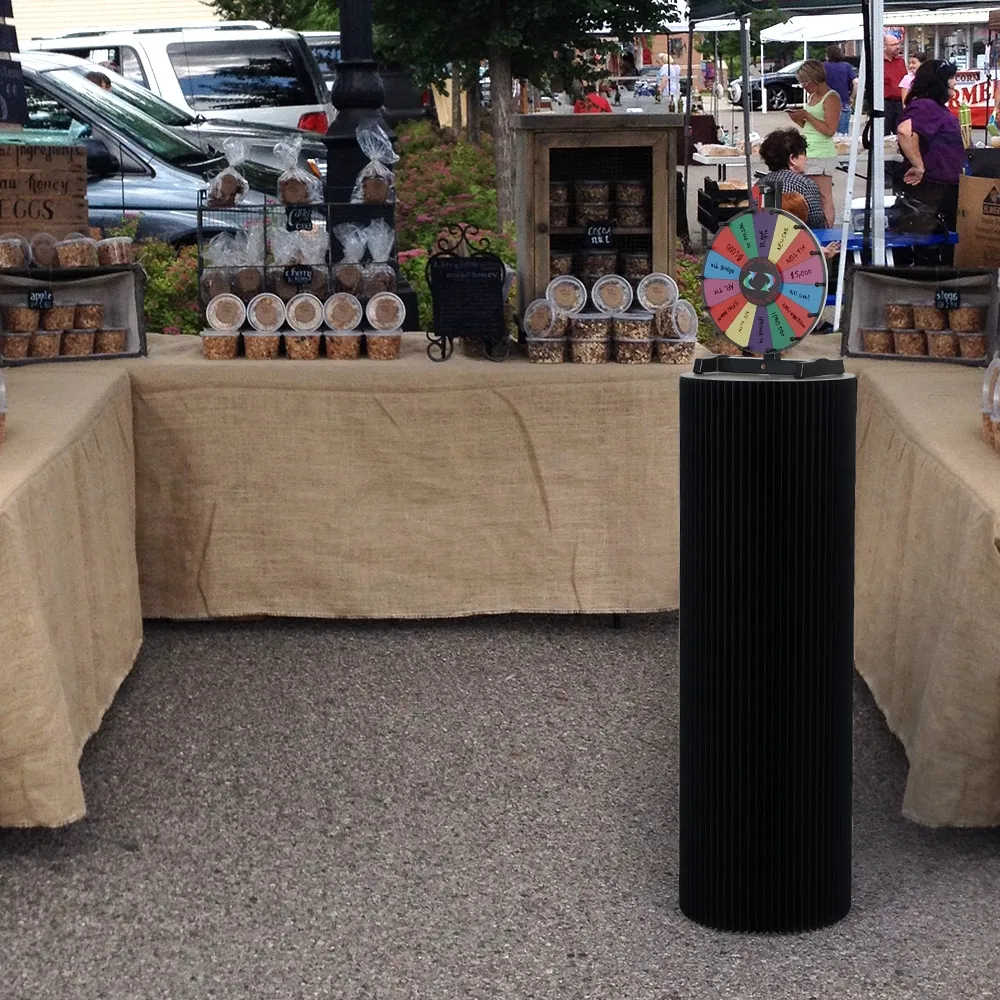 This raffle wheel, like spin to win games, has a paper plinth included to place the game for easier access. This pedestal is 115mm tall, placing the game at an easy to reach height. The plinth is made from recyclable cardboard and features a patented honeycomb internal structure that keeps the unit lightweight but can hold up to 50kg in total weight. The black colour and fluted appearance provide a modern look that fits in well with any location. This plinth also folds down small to only 35mm to be transported and stored with ease. Set-up takes seconds without tools needed, as Velcro strips hold the sides together.