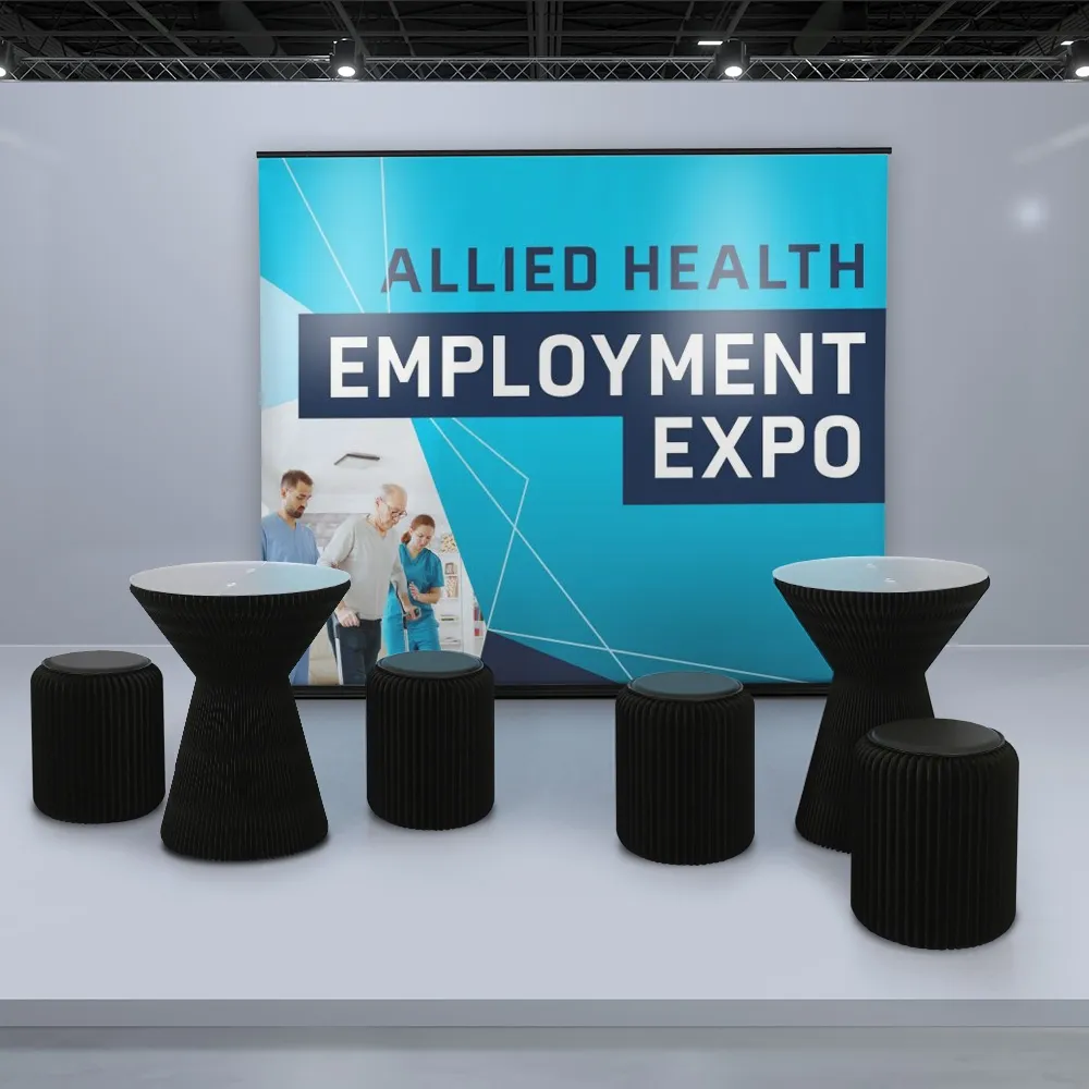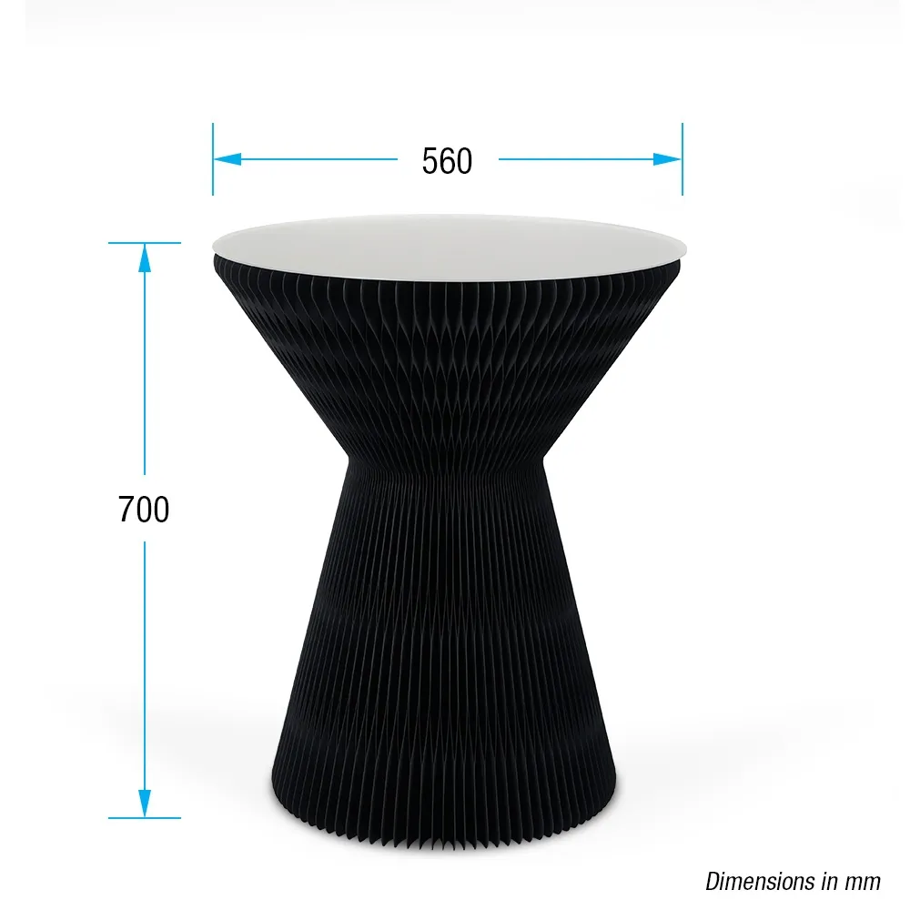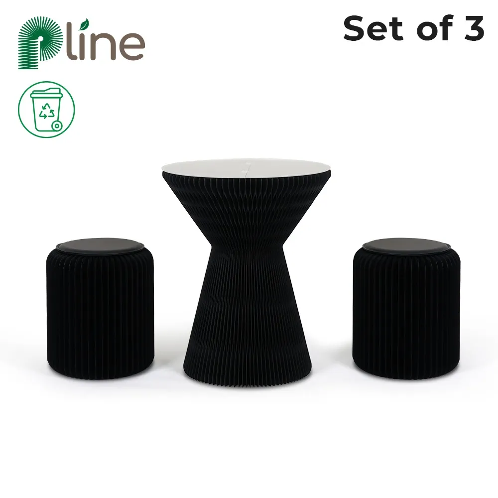 This small table and stools set has a unique modern look that fits in well at weddings, food courts, waiting rooms, birthday parties, galleries, bridal shops and more. Each piece if made from recyclable materials to be environmentally friendly and affordable. The black kraft paper build uses a patented internal honeycomb structure that not only creates the stylish look, but provides lightweight displays that are supportive of a surprisingly large amount of weight. The black colour is neutral to fit in with different décor styles without issue.