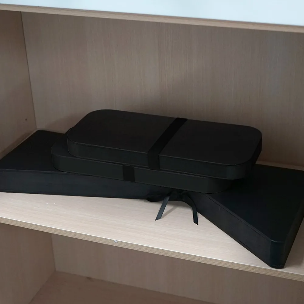 Each piece in this set folds small, with the table 4cm thick and the stools 3cm thick when fully collapsed to be easily stored out of the way. There is a black cushion with 1-2cm of padding for each seat and a 58cm frosted acrylic top to provide a flat surface for the tabletop. The acrylic topper is in two pieces with cut-outs to make it easier to store alongside the rest of the components. Elastics are included as well to help keep the pieces shut when collapsed. Slimline Warehouse has same day shipping to anywhere in Australia with this and most other in stock products if purchased by 3pm AEST, buy online today!