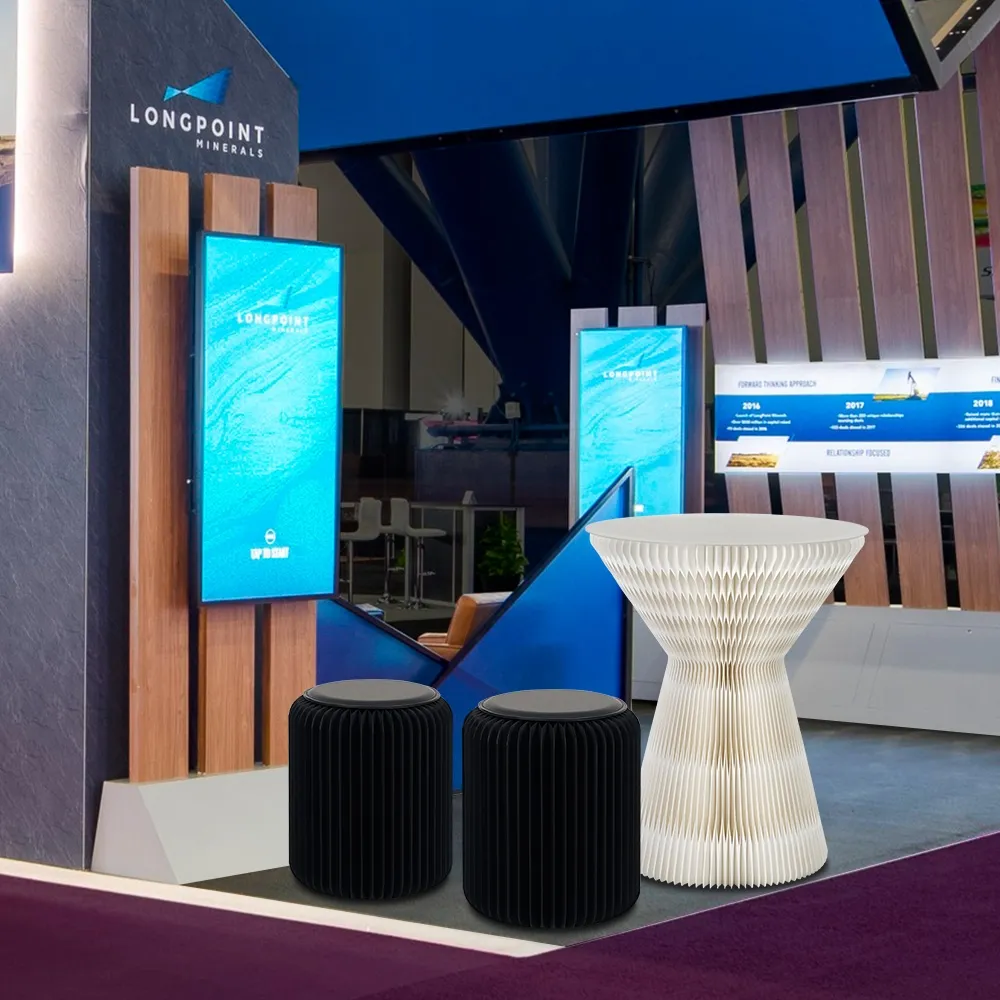 This small table with 2 stools, part of our line of paper furniture, is designed with quick set-up in mind. No tools are needed for full assembly of the collapsible furniture, as magnetic end panels on all pieces quickly snap together and keep the structures upright. There are ribbons integrated into each piece as well as an added measure to keep everything nicely together. The 70cm tall table is the perfect height for people sitting in the 42cm tall stools to reach for their drinks or personal items. A black cushion is included for the stools that has 1-2cm of padding to provide a comfortable seat.