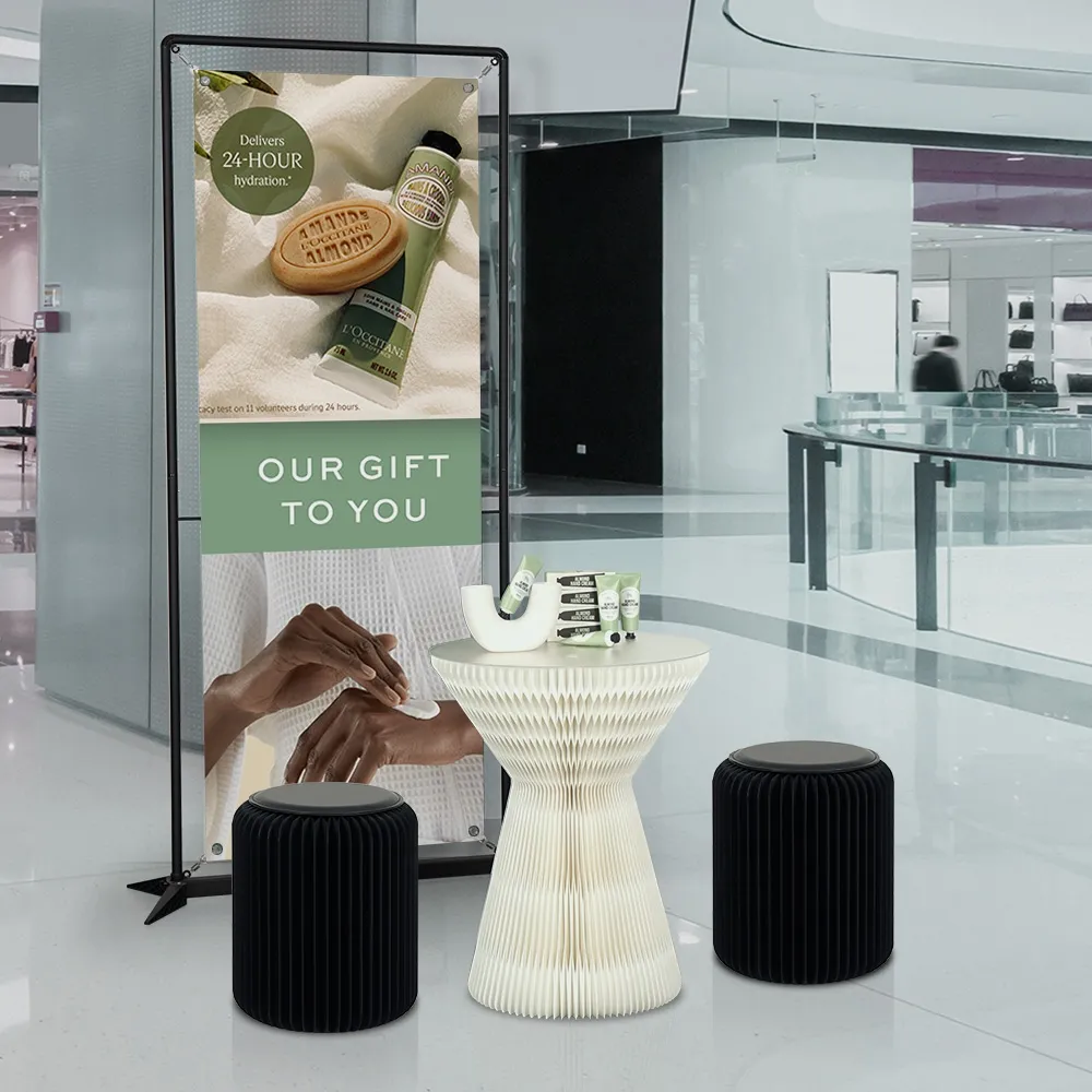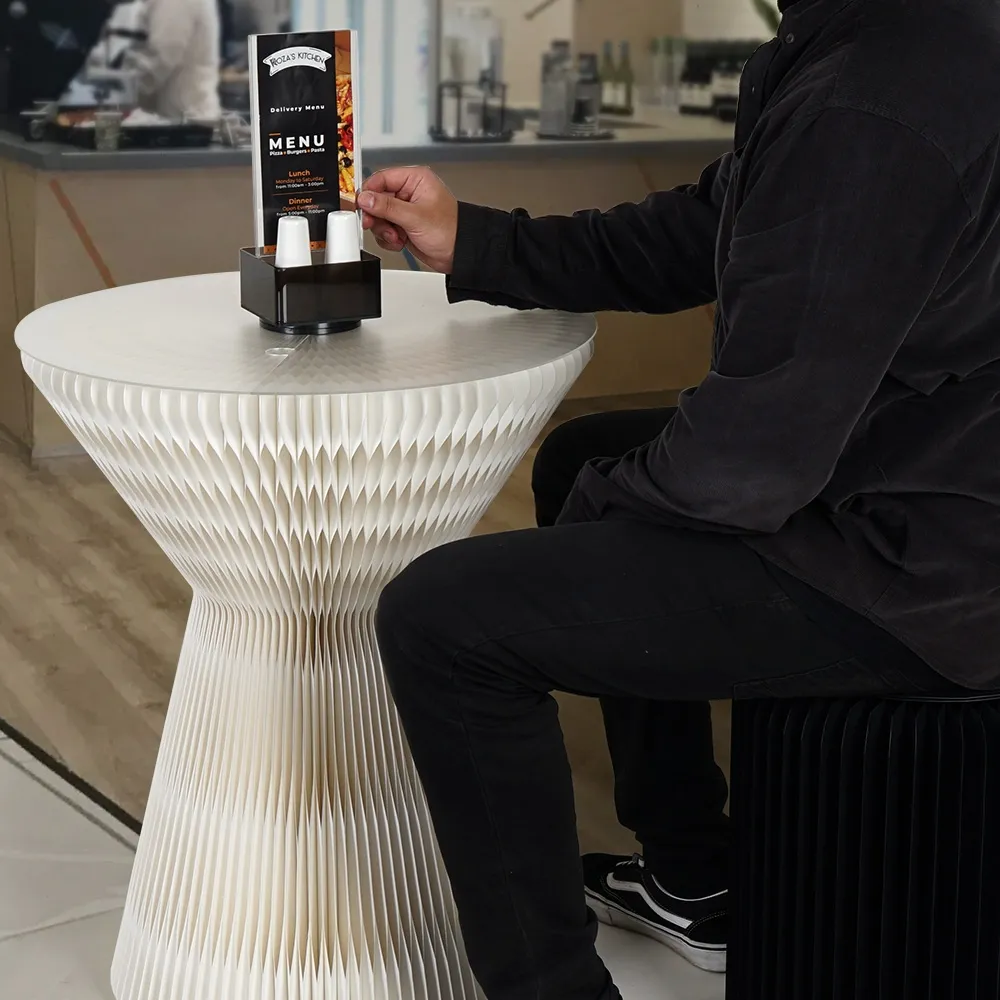 This small table with 2 stools is made from recyclable cardboard to provide environmentally friendly displays that are lightweight, portable, and have a modern design to look good in any location. All pieces are made from kraft paper that uses a patented honeycomb internal structure that allows the pieces to be collapsed small whilst supporting a large amount of weight. Each stools is designed to hold up to 300kg in total weight, and the table holds up to 100kg to easily accommodate drinks, personal items, or even galleries pieces or merchandise. The table is made from white paper and the stools from black kraft paper for a contrasting design that works well in bridal shops, weddings, retail stores, office lobbies, galleries, pop up events, and more.