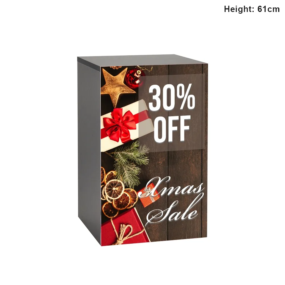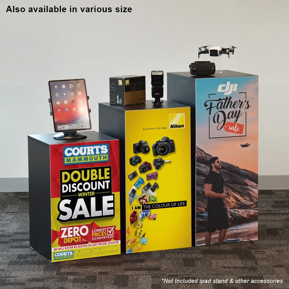 This black plinth, part of our line of retail store fixtures, has a printed PVC board that fully takes up one side on the stand. The custom printed artwork uses your graphic design, which are then reviewed by our expert print team and digitally printed for an accurate representation with vivid colours. If you need help with your graphics, our expert design team is available, with different tiers to choose from so you can get the exact advice and design help needed. The PVC board is 38cm wide to fully take up an entire side of the display. There are two other sizes of plinth also available, buy a set of to create a step retail display that really grabs the attention of passersby!