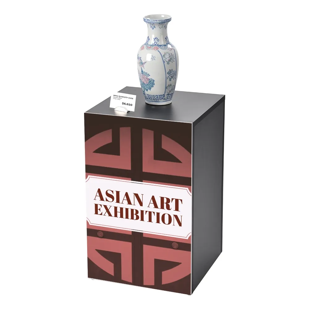 This black plinth features a display pedestal to showcase items, with a printed PVC board on the front providing branding and advertising to attract customers! The exhibition pedestals have are 61cm tall to raise merchandise or gallery pieces up for easy viewing and highlighting. The plinth stands have a 38 x 38cm top area that easily holds a wide variety of items without issue. Raising items up using these pedestal stands really set them apart, and helps draw attention and makes it easier for visitors to focus on presented items.