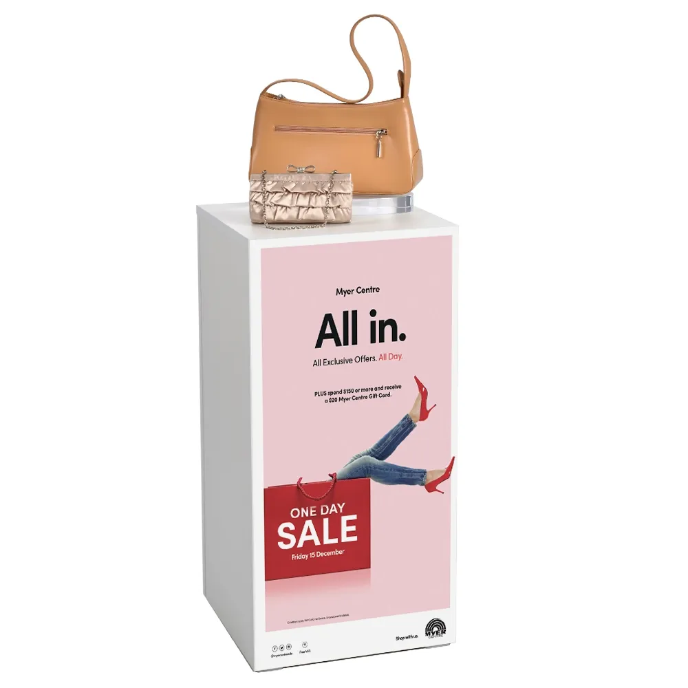 This floor standing plinth, white laminate display pedestal is used in retail stores, exhibition halls, shopping centres, and at events to help promote brands and displays for customers! There is a printed PVC poster included with your purchase that utilises custom designs to help grab the attention of visitors. This poster is 38 x 76cm, entirely taking up one side of the plinth to offer heaps of space for branding, promotions, and information for customers to view! Additional prints are also available to make updating for new sales and events quick and easy without having to purchase an entire new set. If in need of design help, our expert team is ready to assist, with three tiers to choose from to find the right one for your needs.