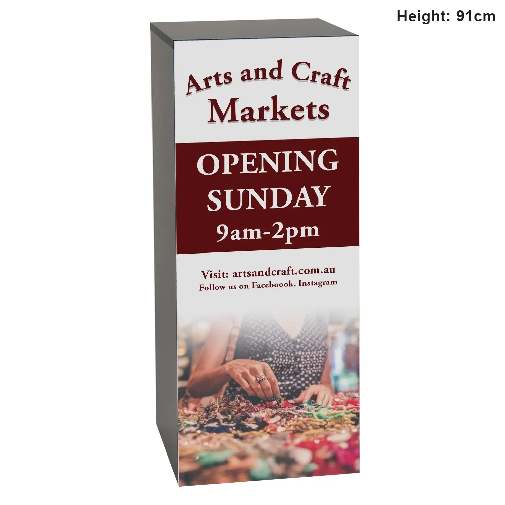- Poster is 91 x 38cm to take up one full side of 91cm tall plinth