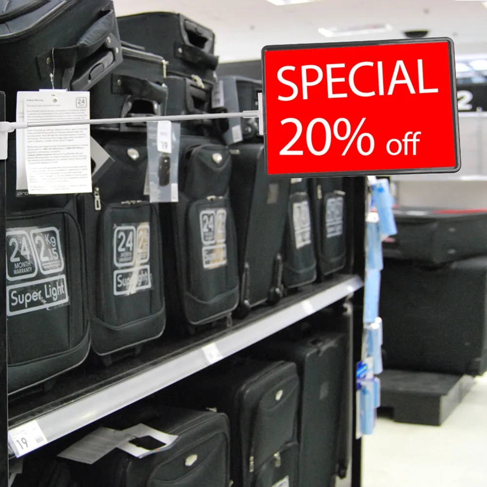 Retail sale stand features a magnetic base that is easily attached to steel surfaces such as store fixtures, retail shelving, and more to easily be installed at your business. A hinge on this base allows you to easily adjust the tilt on the pole to better fit in with your needs! These store displays make a great addition to any marketing effort as the eye-catching design makes it easy to show price points, new sales, product information and more! The signage holders fit A4 (297 x 210mm) graphics that are in portrait or landscape orientation to provide a versatile display that doesn't hold back your marketing team by only being able to be used in one format!