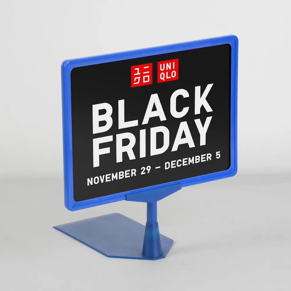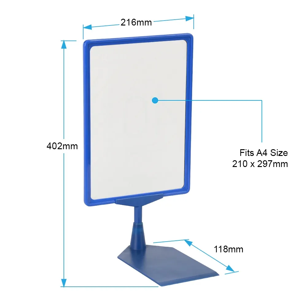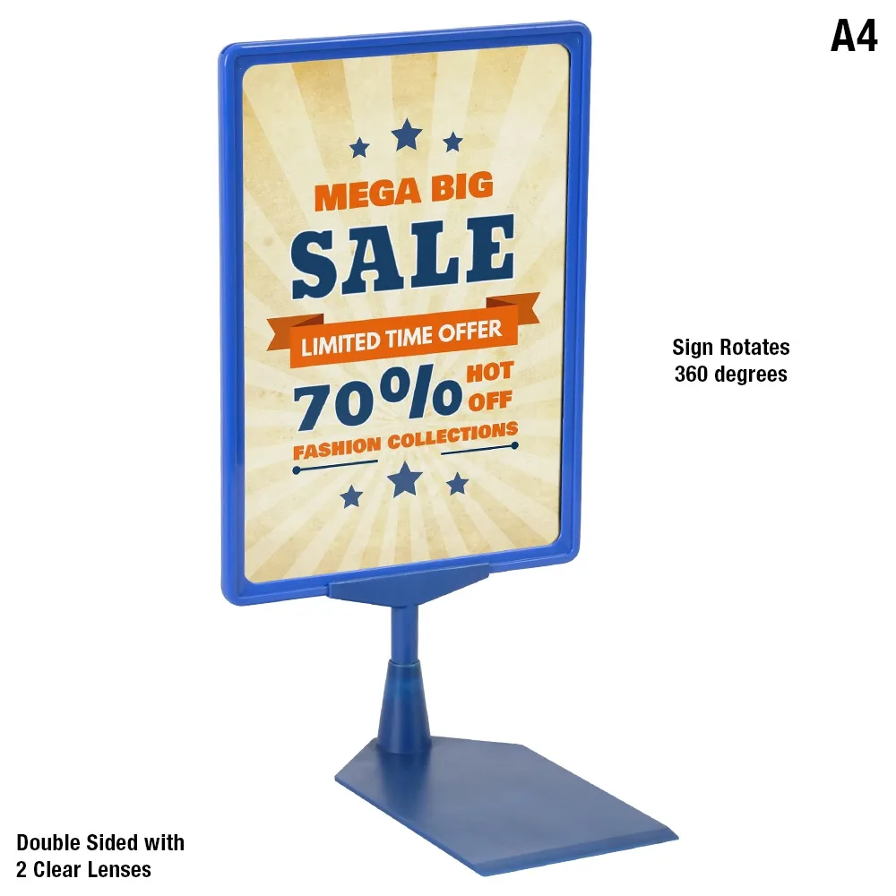 The shelf sign in blue holds A4 (297 x 210mm) graphics with the double-sided frame. It can be used in both portrait and landscape orientation with the frame rotating 360° so you can position best suited to your display. Perfect for pricing, warranty information, product details, store promotions and more! This eye-catching display is inexpensive but durable and can be used anywhere around your store.