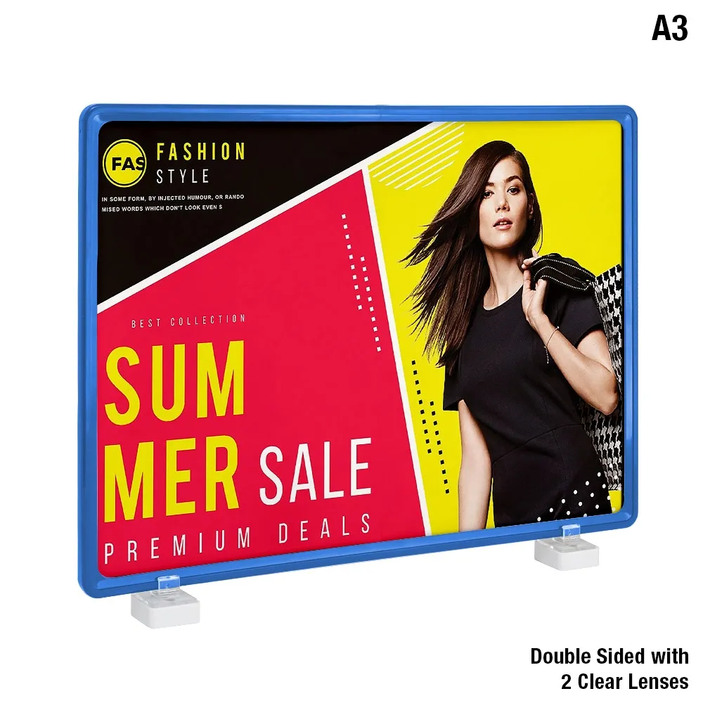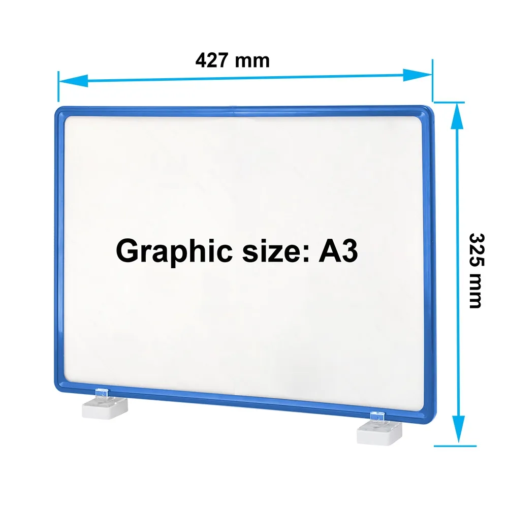 Blue price display is dual side to help maximise exposure to your customers with large A3 (420 x 297mm) graphics that can be displayed in portrait or landscape orientation. This inexpensive and durable signage is a staple for any retail store to show pricing, warranty information, product information, stores hours or promotions. Clear lenses are also included to help protect your graphics from dust and grime.