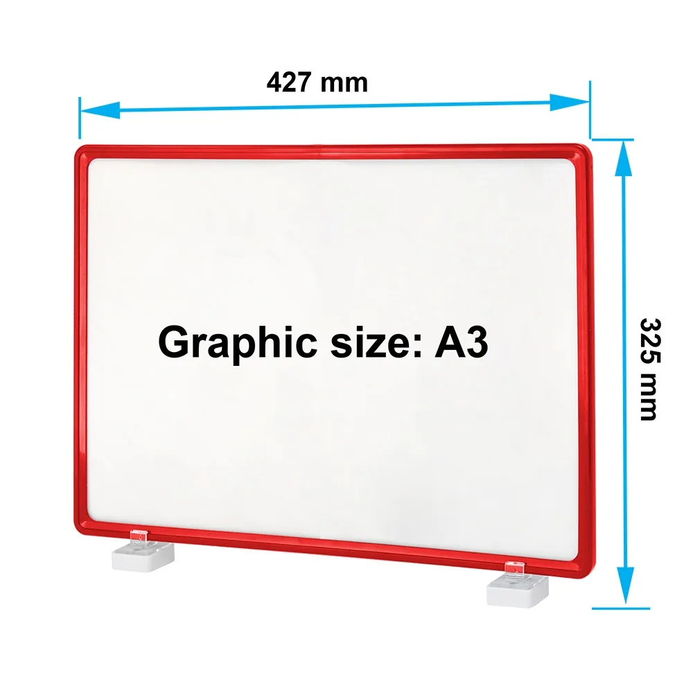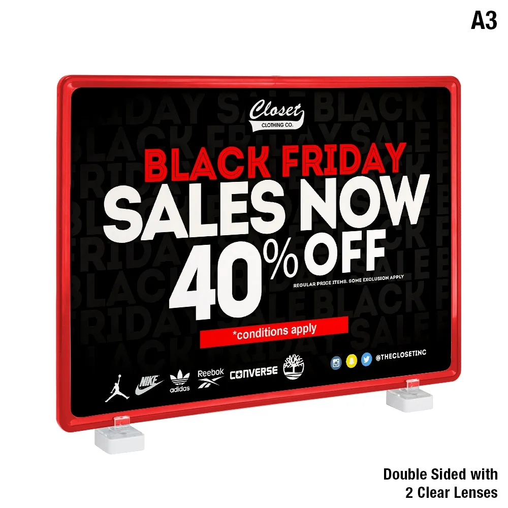 The A3 red POS display holds 420 x 297mm graphics that are protected by the included clear lenses, stopping damage and dust build up. Update your sign graphics easily and within seconds thanks to the slip in design. This versatile sign can also be used in portrait or landscape orientation. Order before 2PM AEST to receive same day despatch from our Melbourne warehouse to anywhere in Australia.