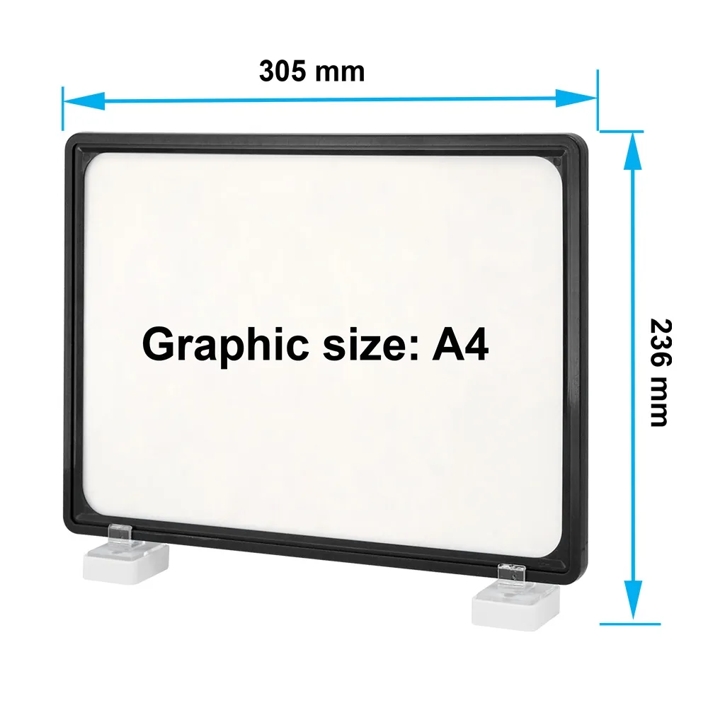 Designed to hold an A4 (297 x 210mm) graphic in landscape or portrait orientation