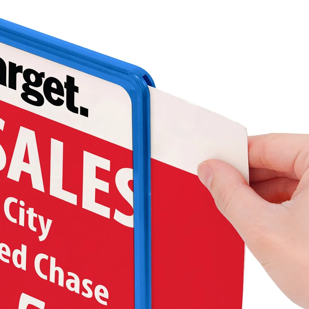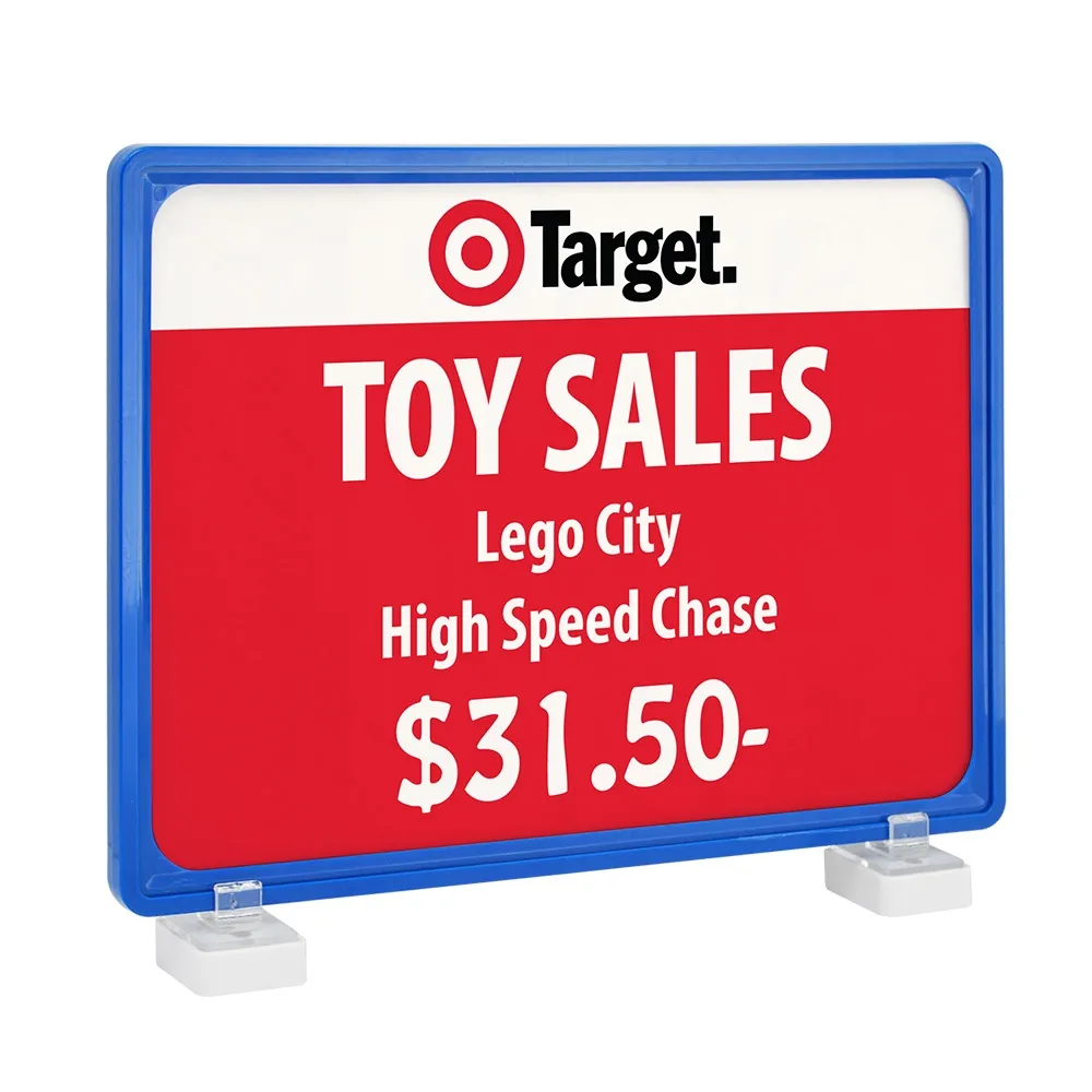 Blue POS sign comes with 2 magnetic holders which snap onto the frame to create a display that can attach to metal store fixtures. Great for pricing, product information, promotions and store trading hours. The display is double sided to help optimise exposure and comes with 2 clear lenses. These lenses help to keep your display look professional at all times and dust-free!