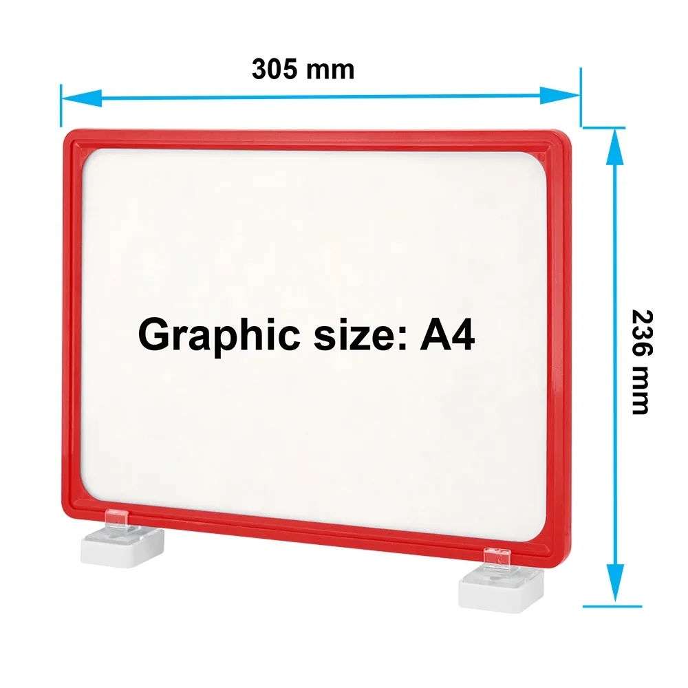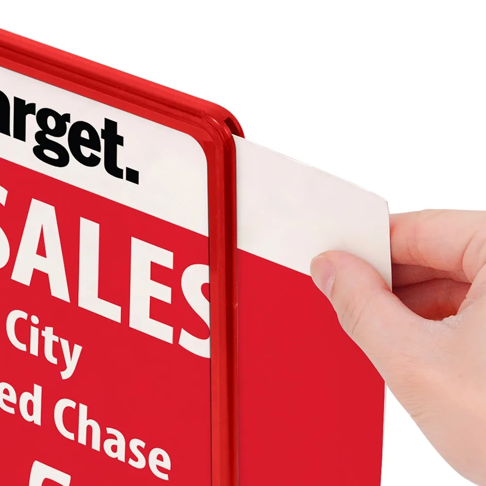 A4 magnetic display is perfect for advertising pricing, product information, promotions or store trading hours. The magnetic holders attach onto metal shelving and fixtures for a convenient sign that can be used anywhere around your store. The red frame draws attention and the double-sided graphics maximises exposure of your signage to customers. The A4 (297 x 210mm) sign comes with 2 clear lenses to help protect your graphics and keep them looking professional at all times.