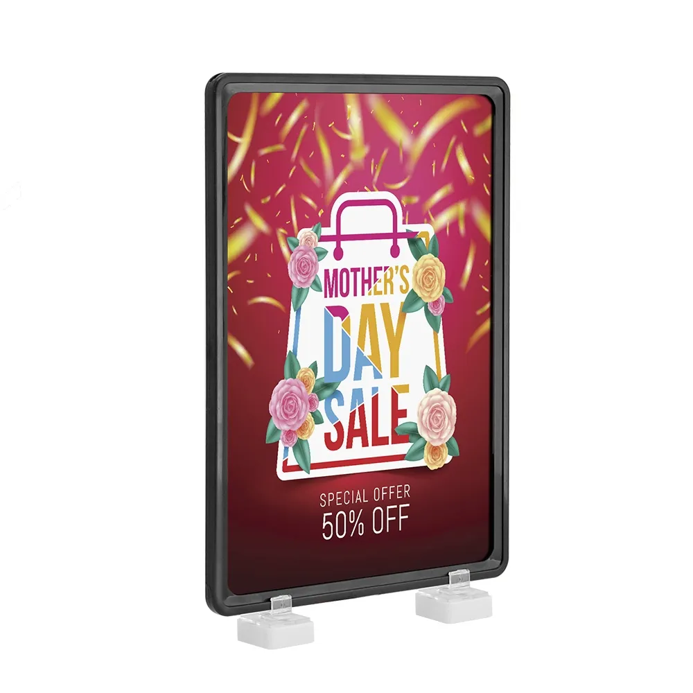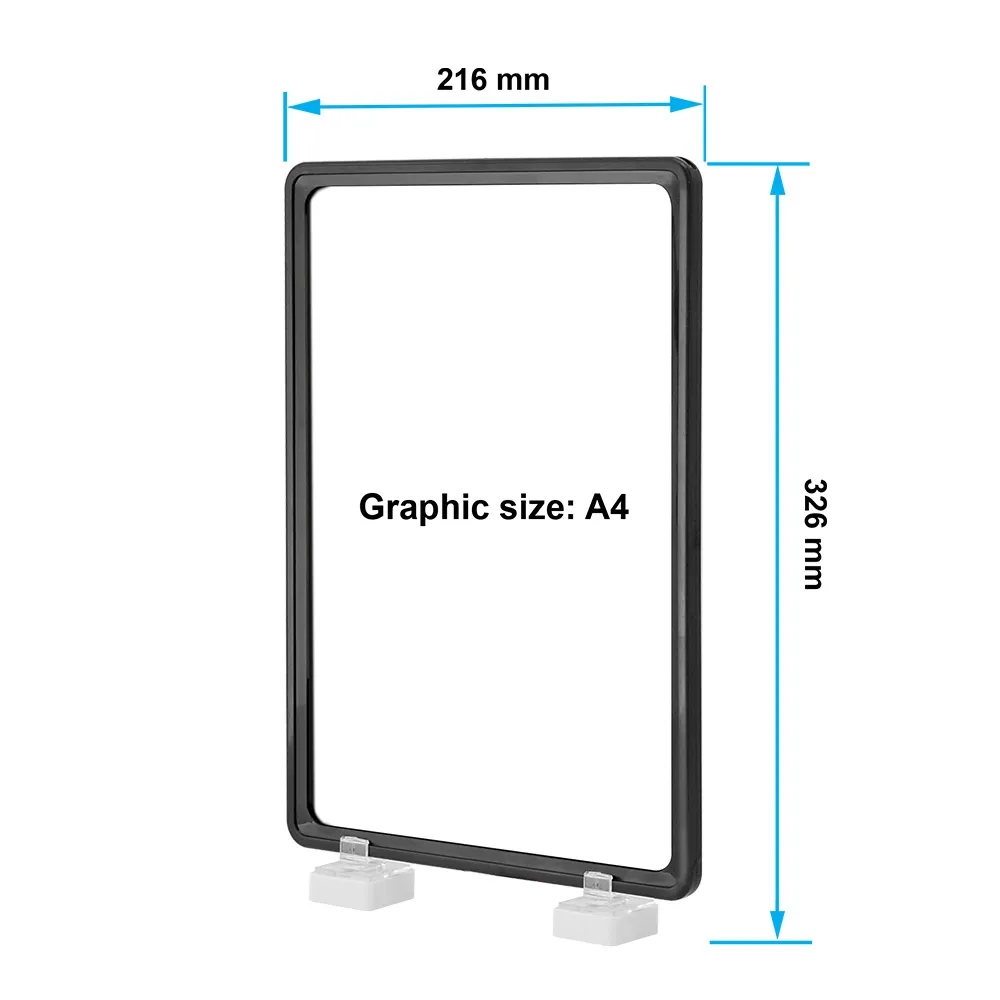 This black price display makes a welcome addition to your advertising scheme. These inexpensive store sign holders help make marketing in your business an easy task. This retail sign holds an A4 (297 x 210mm) poster in either portrait or landscape orientation. This holder is also designed to hold dual-sided graphics in order to reach more customers from a single stand without taking up additional space!