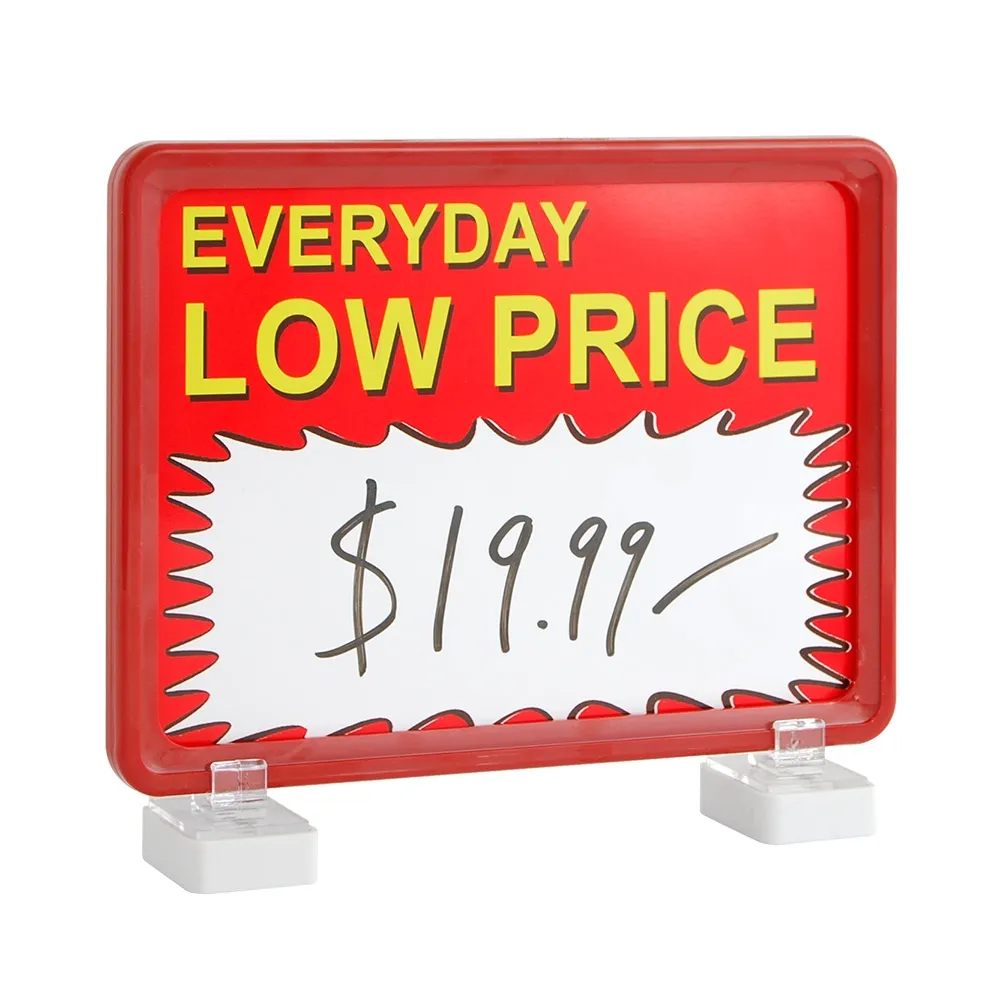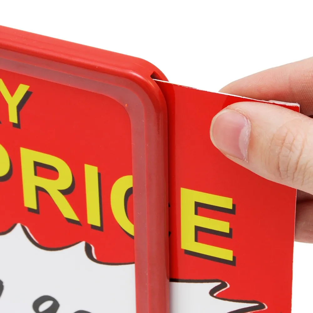 This red A5 signage is a marketing staple for any retail store! Display pricing, product information, store trading hours or promotional material with ease. The magnetic holders secure to metal store fixtures such as floor stands and shelving. Perfect for high traffic areas and gaining customers attention with the bright coloured frame and dual-sided graphics, optimising exposure. An inexpensive but effective way to market your products to boost your business’ sales.