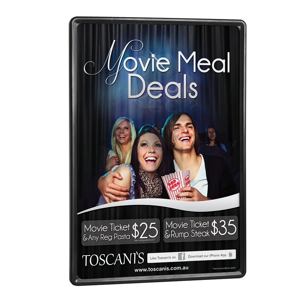 POS frame in black come with clear lenses for each side of the frame. This ensures your graphics will not gather grime and dust while on display to maintain a professional appearance. Switching out your graphics is easy with the slide-in design of the frames, with no tools required! These signs can be held in a variety of manners, allowing you to easily affix each one at your business using plastic clips, metal stands, and more. Shipped from our Melbourne warehouse, order before 2 PM EST and receive same day despatch to anywhere in Australia!