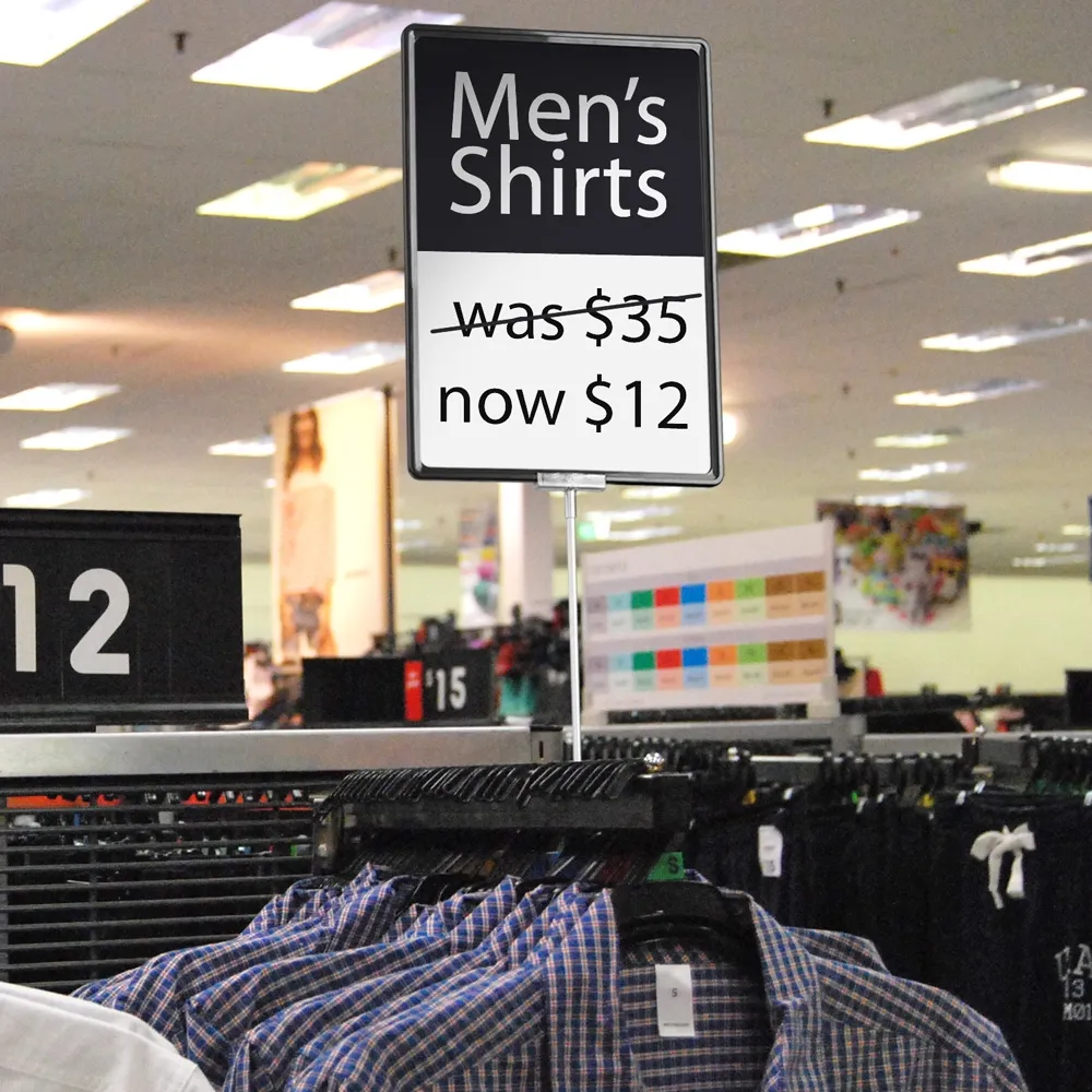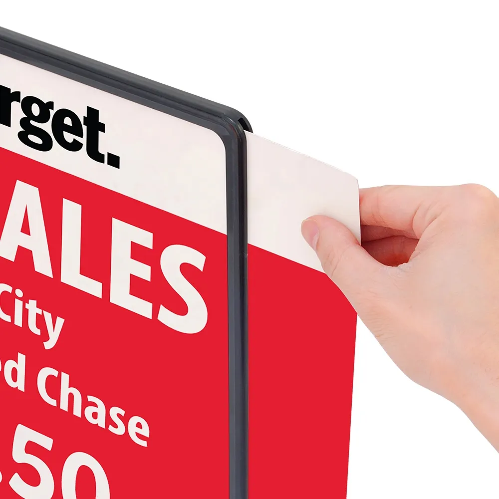 POS frame in black helps to promote upcoming sales, price products, or ongoing events in an eye-catching manner that will easily get the attention of patrons. These retail POP signs include multiple colours to best match your décor or to stand out to easily be seen. Sign holders are designed to hold an A3 (420 x 297mm) graphic in portrait or landscape orientation. These custom graphics are held in a durable plastic frame that will last for years to come, even when used in heavily trafficked locations all day long! Retail display holders are dual-sided units that can be mounted to maximise space whilst reaching more customers.