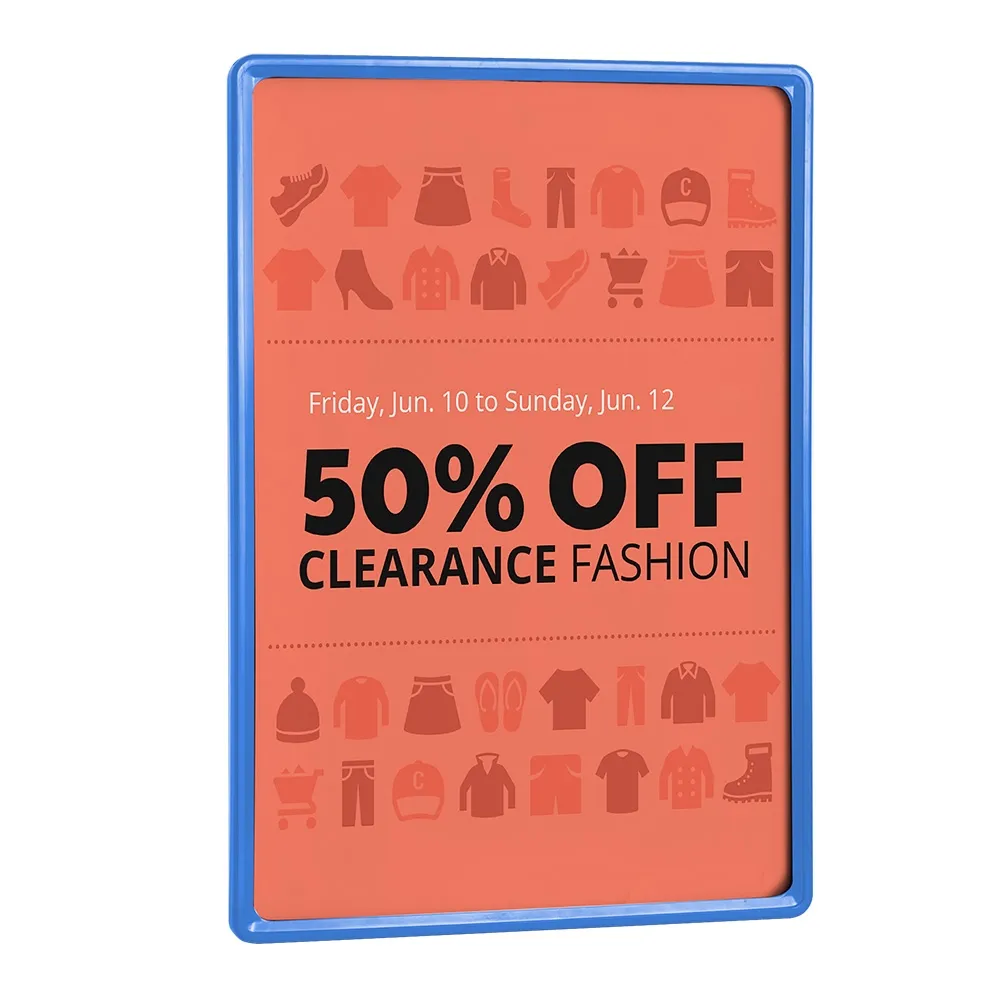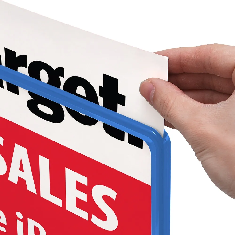 Blue A3 frame makes a great marketing tool to display pricing, product information, promotions, store trading hours and more! These sign holders are designed to hold A3 (420 x 297mm) graphics in portrait or landscape orientation, giving you the flexibility to change based on your graphic design. The signage is double-sided maximising exposure to your customers without taking up additional floor or shelf space. Made from durable plastic these signs last the test of time, even when used in high traffic areas!