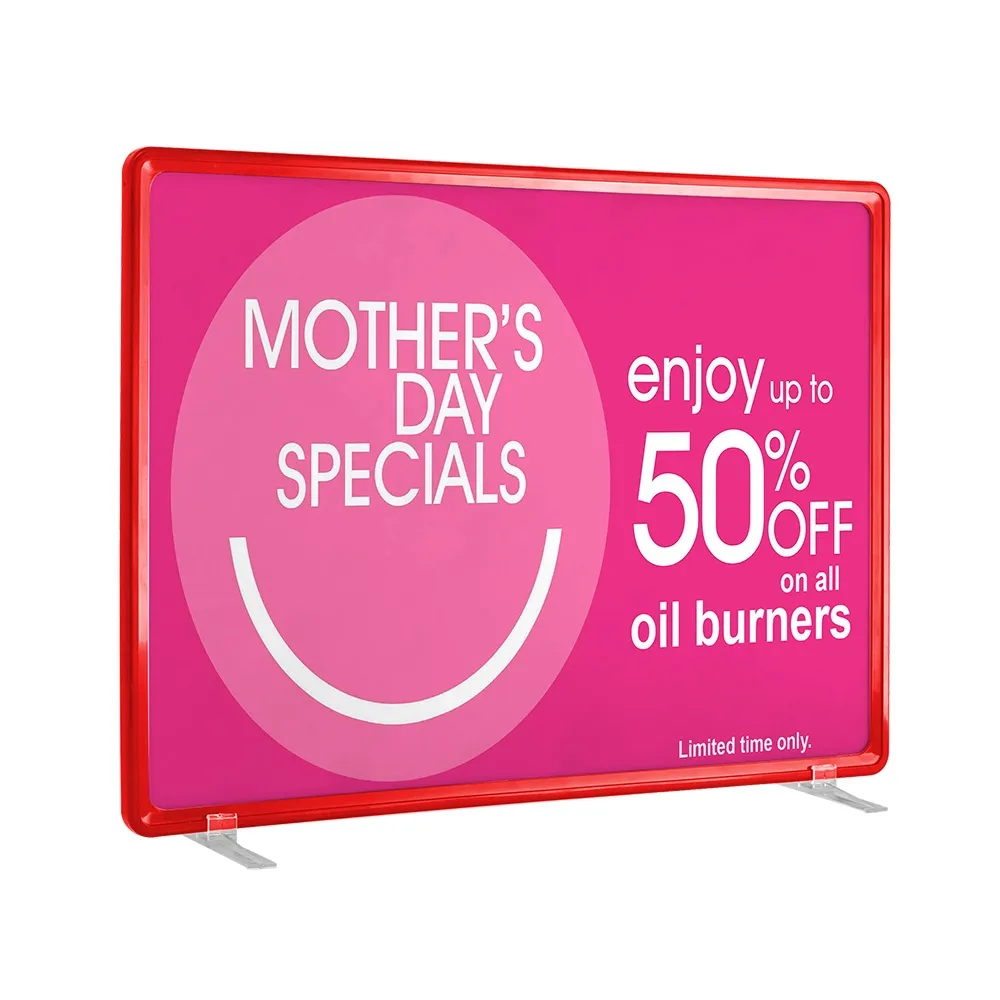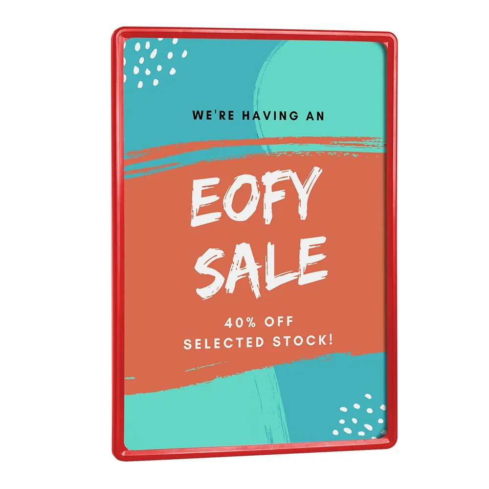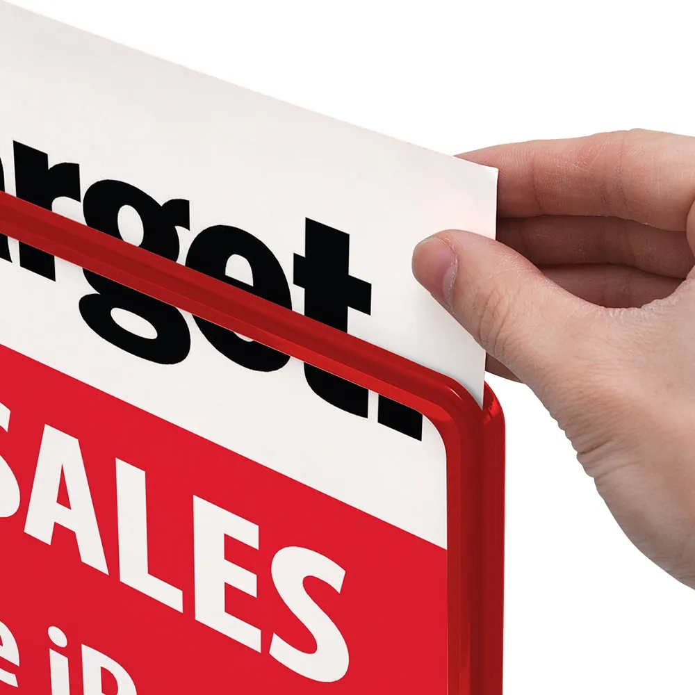 Plastic frame for retail stores comes in a vibrant red colour to draw attention to your in-store display! Promote sales, product information or pricing cost-effectively. Included in your purchase are 2 clear lenses, these help to protect your graphics from dust and grime to keep your display looking professional at all times. The POS display has an easy to use slide-in design, allowing you or staff members to change out graphics in seconds!