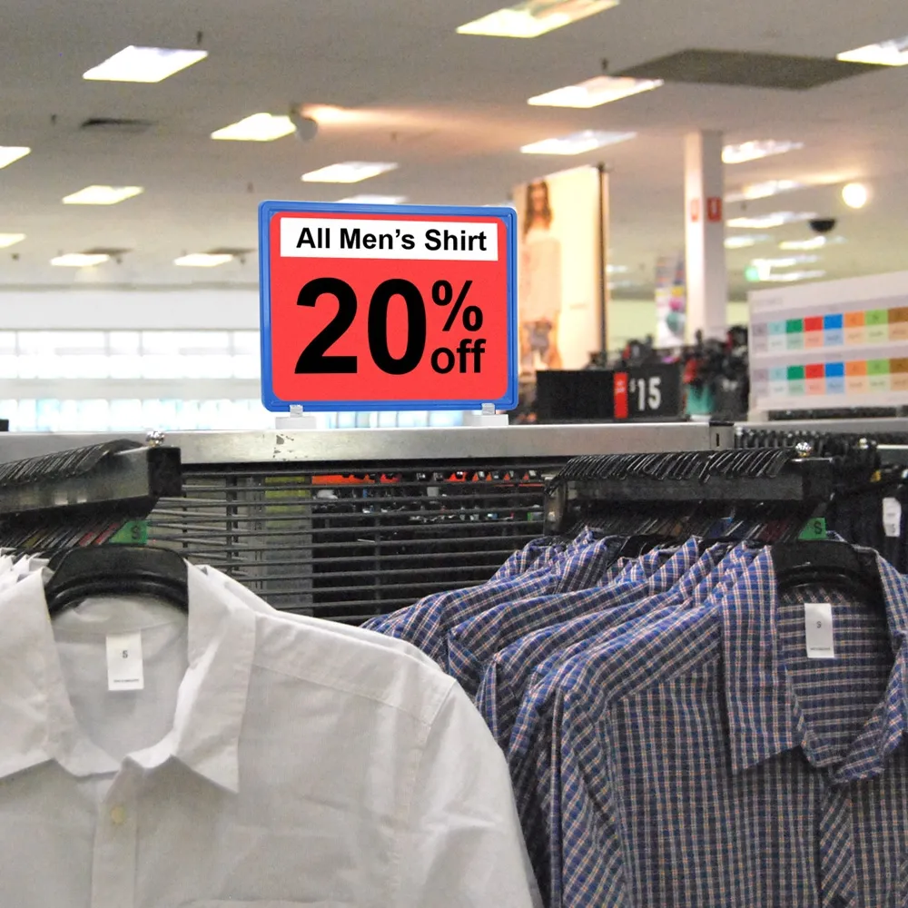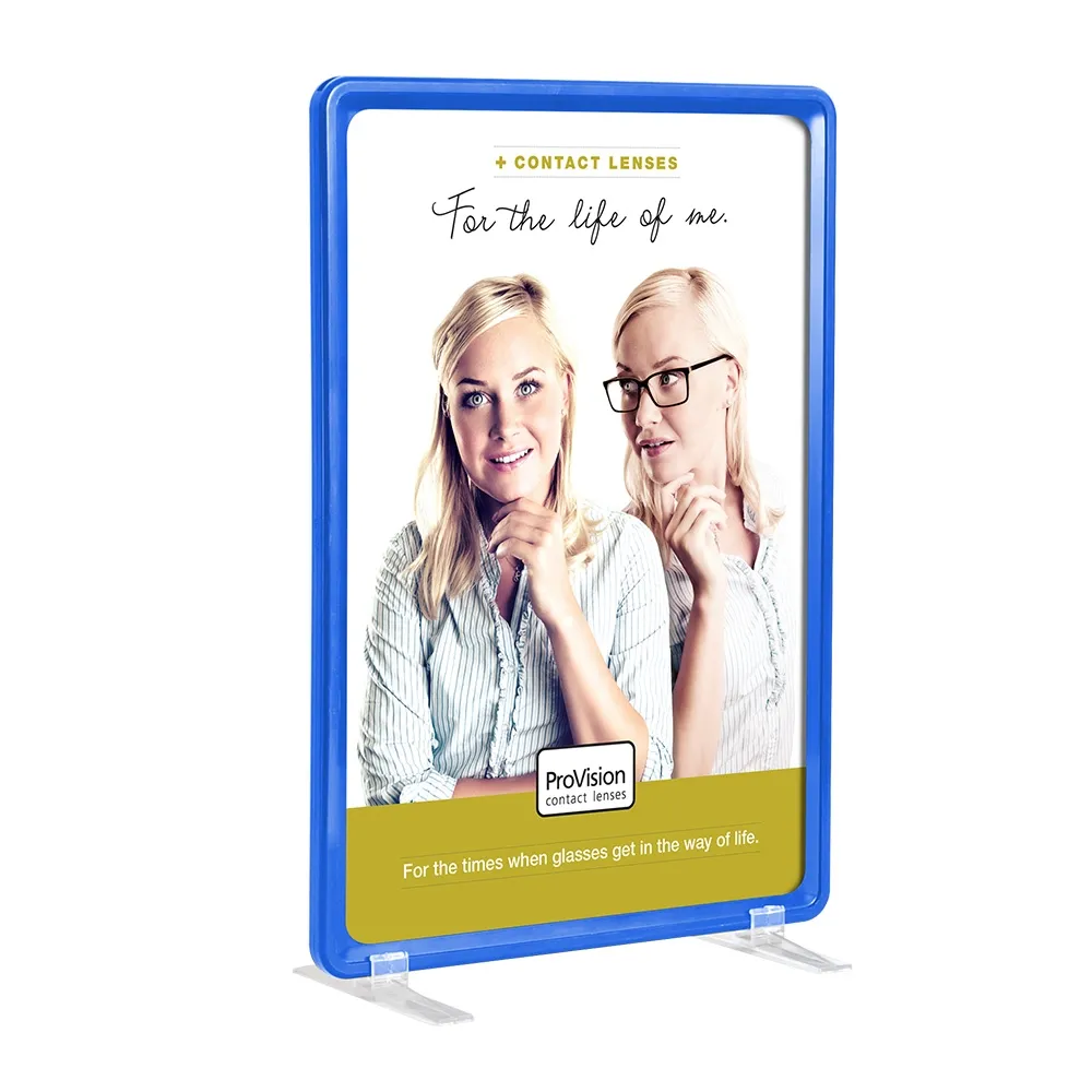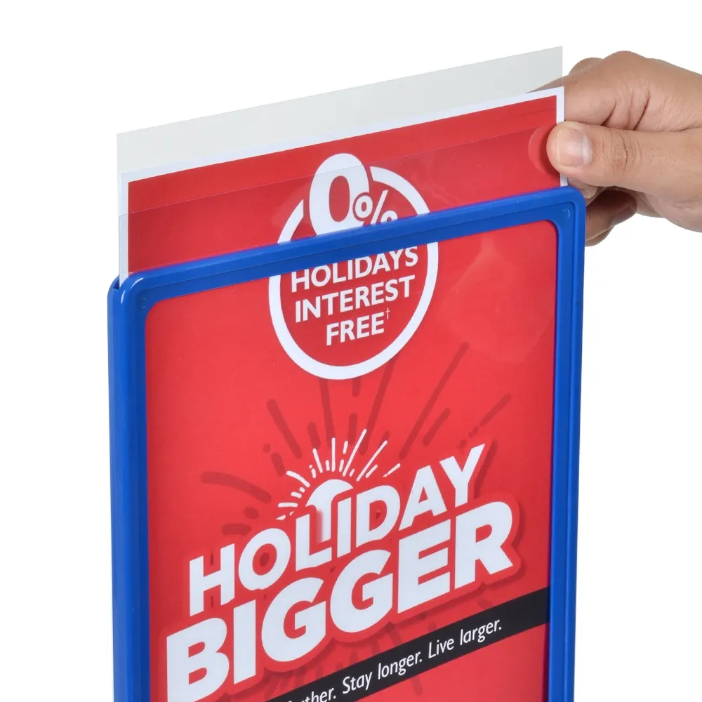 Frame display in blue helps to draw attention to your graphics and products. Advertise promotions, product pricing and information with ease! The double-sided signage comes with 2 clear lenses to help protect your graphics from dust and keep them looking professional at all times. This is a great inexpensive and durable tool to help your in-store marketing. This frame is great for retail stores, cafes, supermarkets, trade shows and more!