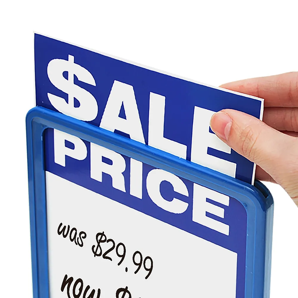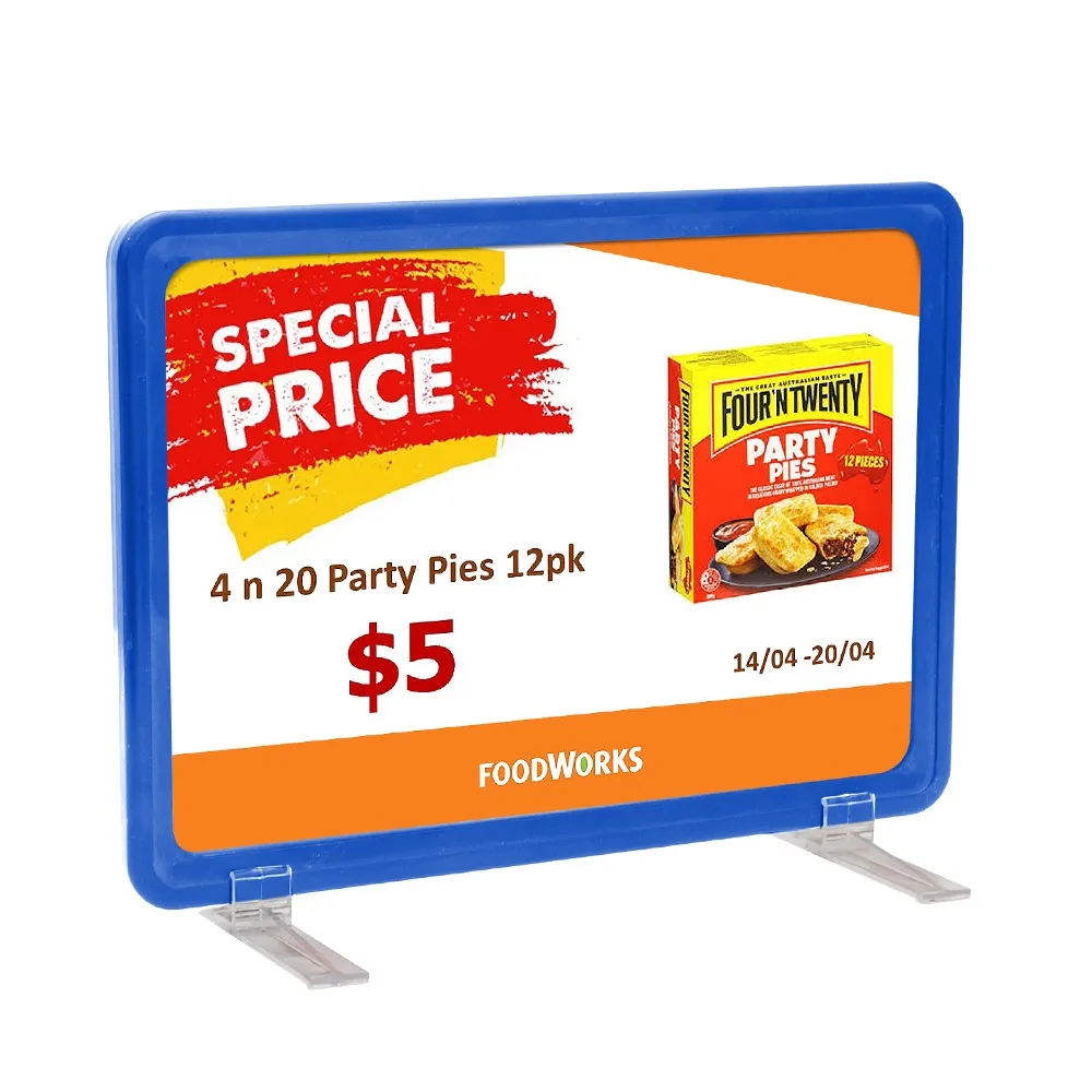 Blue A5 frame for retail stores to display pricing, product information, promotions and more! This convenient and durable sign is double-sided allowing you to maximise exposure to customers without taking up additional floor space. The bright sign draws attention in high traffic areas and is perfect for supermarkets, cafes, retail stores and trade stores. Included in your purchase are 2 clear lenses, these help to stop dust and grime build-up, ensuring your display looks professional at all times.