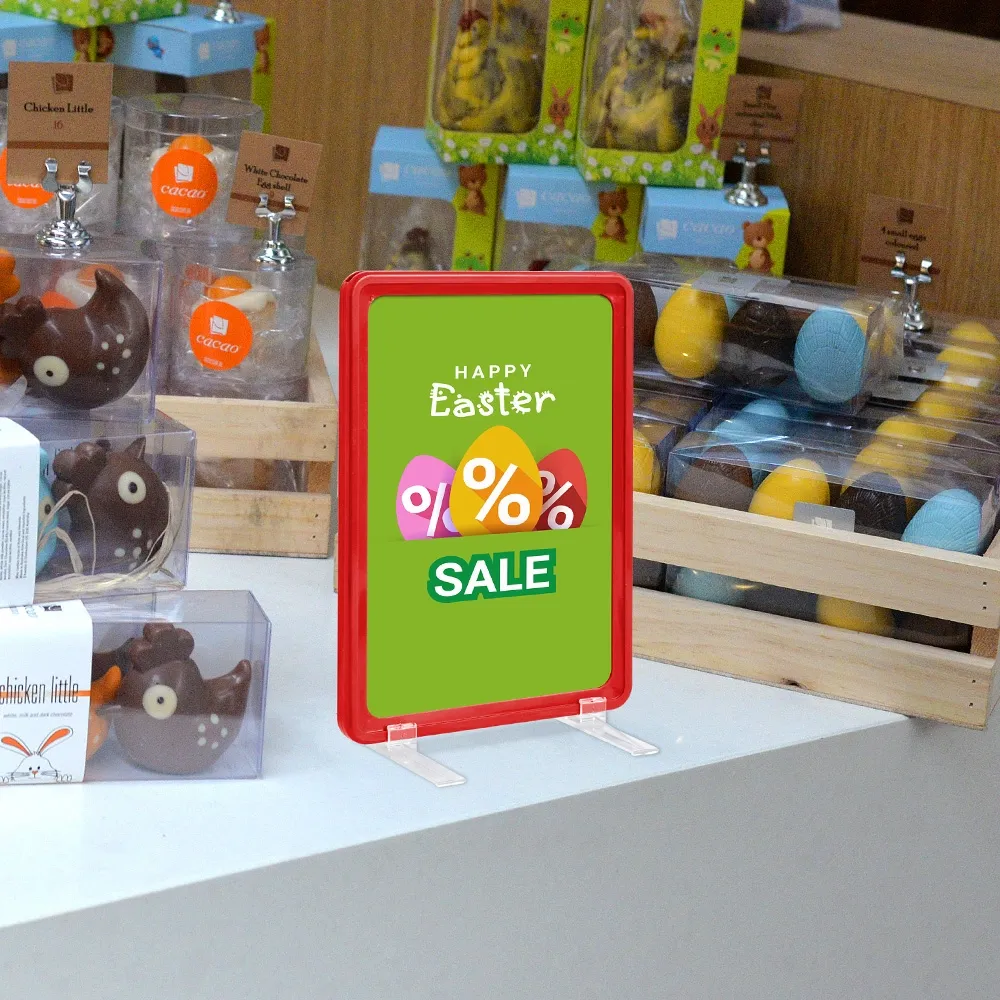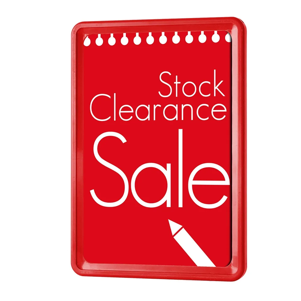 - Signage in red A5 (210 x 148mm) holds graphics in portrait or landscape orientation