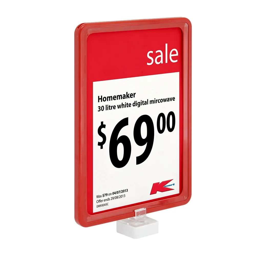 Signage in red A5 holds graphics (210 x 148 mm) in landscape or portrait orientation depending on your preference or graphics. This versatile display can be used in supermarkets, retail stores, trade stores or cafes. It is a great way to market products, display pricing or product information and even to display promotions in your store. The frame is also double-sided which helps to maximise exposure without taking up any additional floor space.
