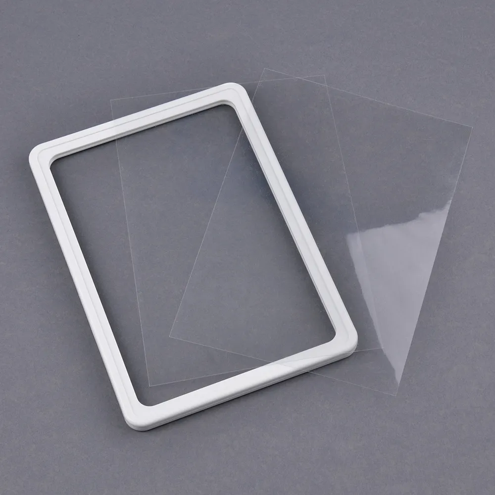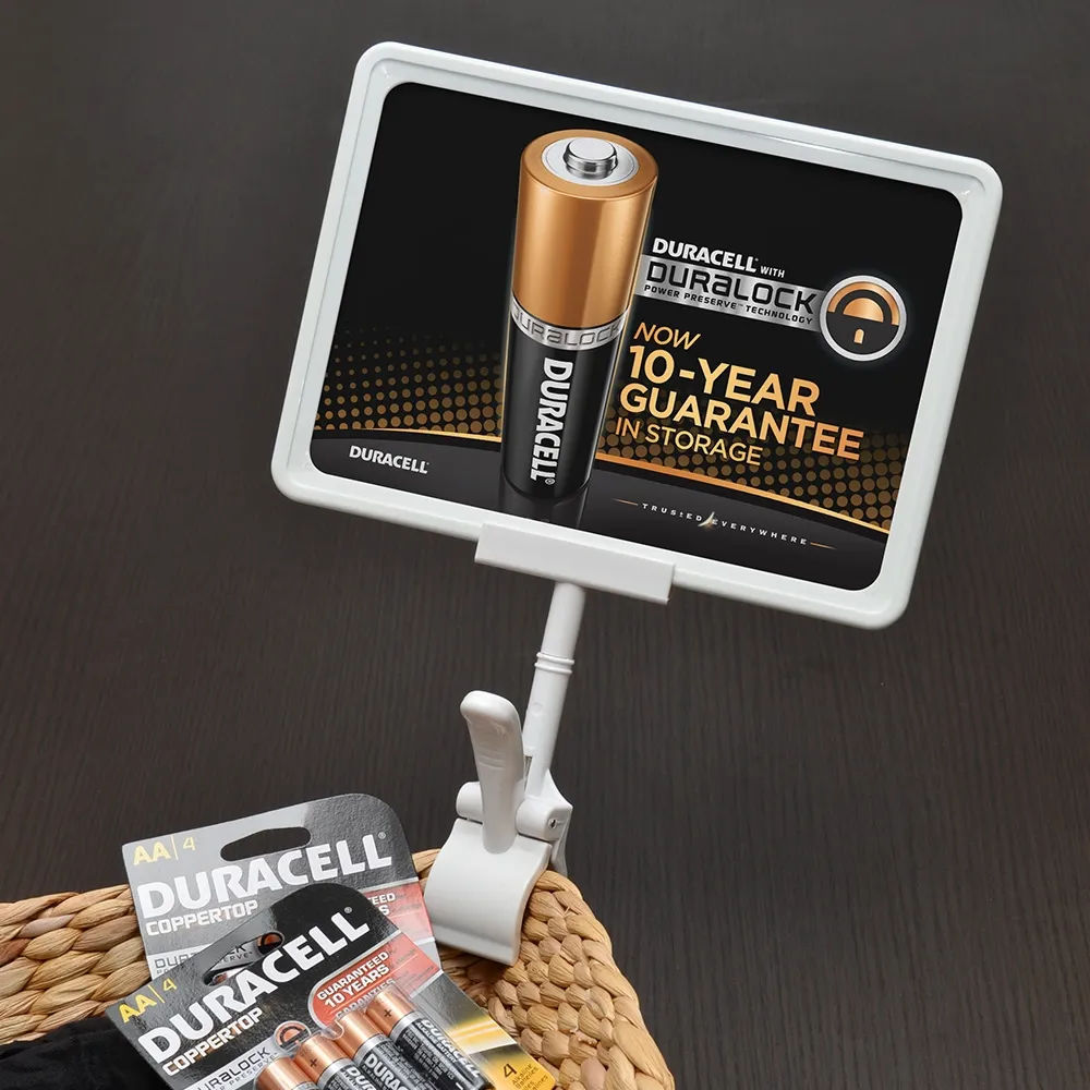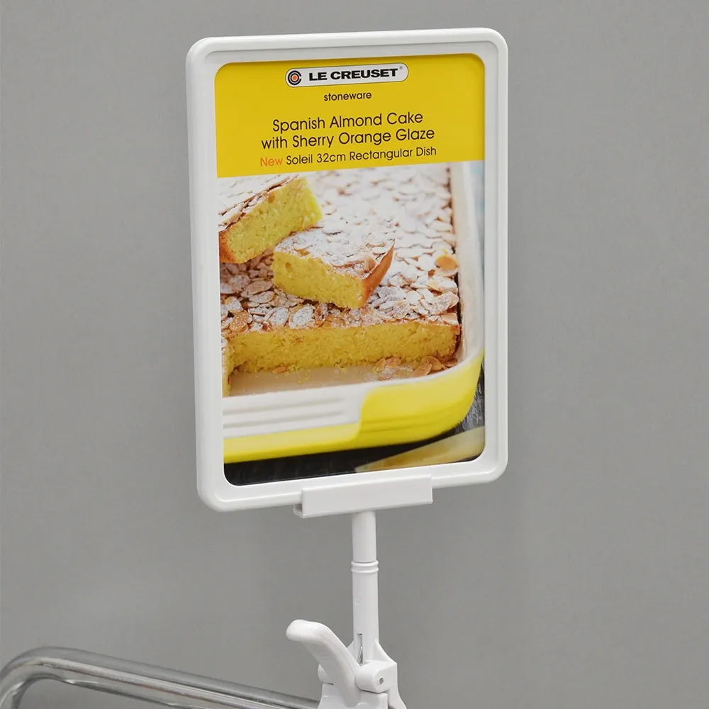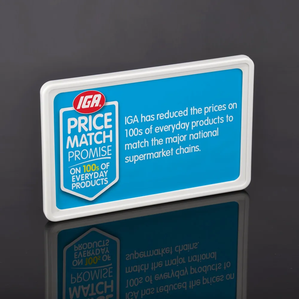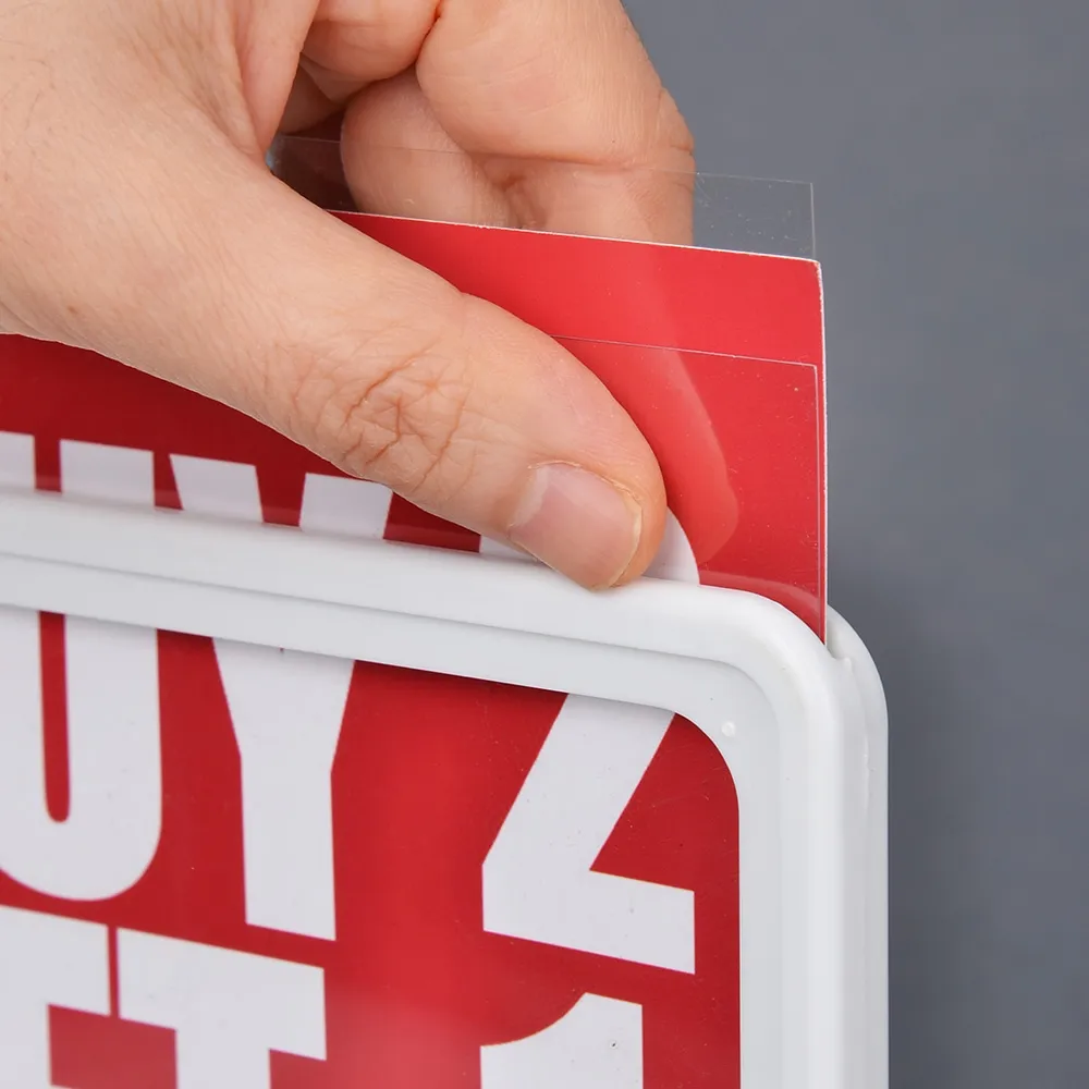 The pricing signs, like custom retail displays, use a 10mm thick frame that can be held by sign grippers, magnetic feet, plastic holders, and more with ease. The frame is made of white plastic, offering a professional look that is low-cost and durable for daily use. Switching out graphics is easy thanks to the simple slide-in design. The back of the frame features slots for attaching to our range of shelving clips and aisle invaders.