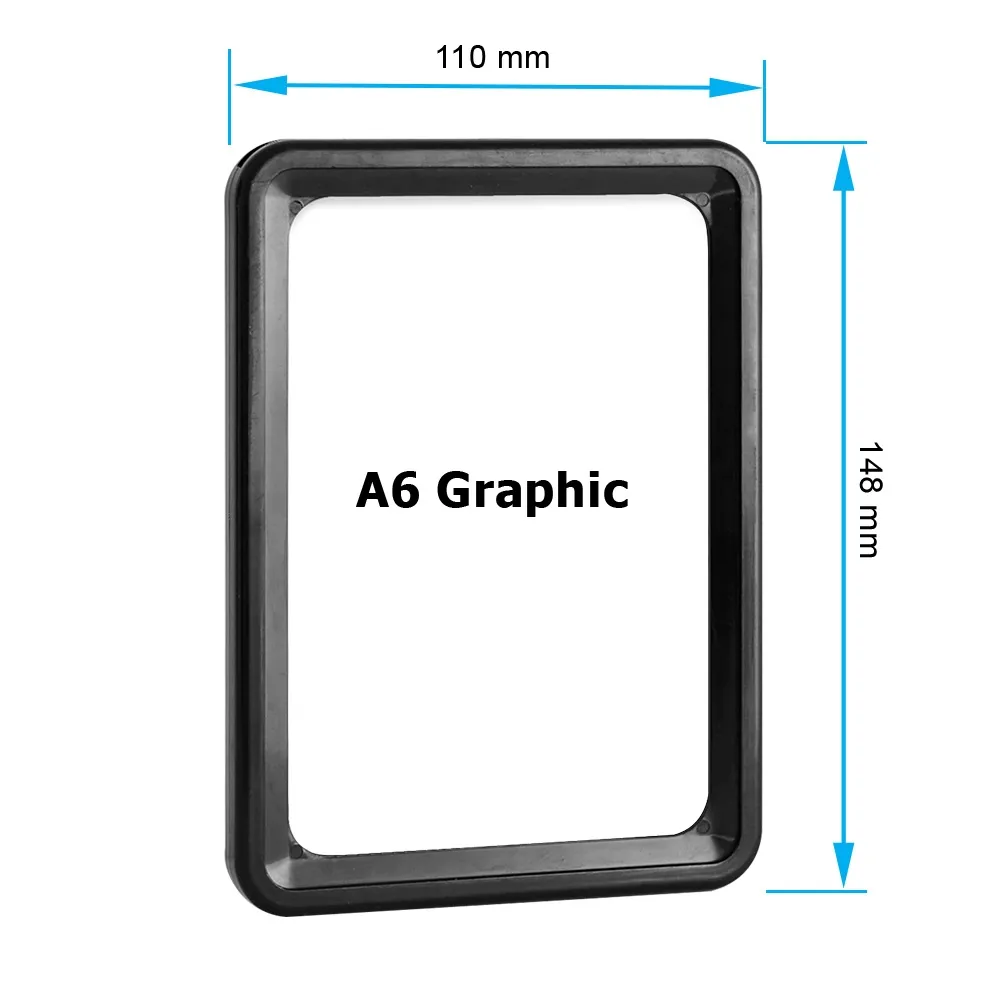 - Black A6 signage holds 148 x 105 mm graphics in portrait or landscape format