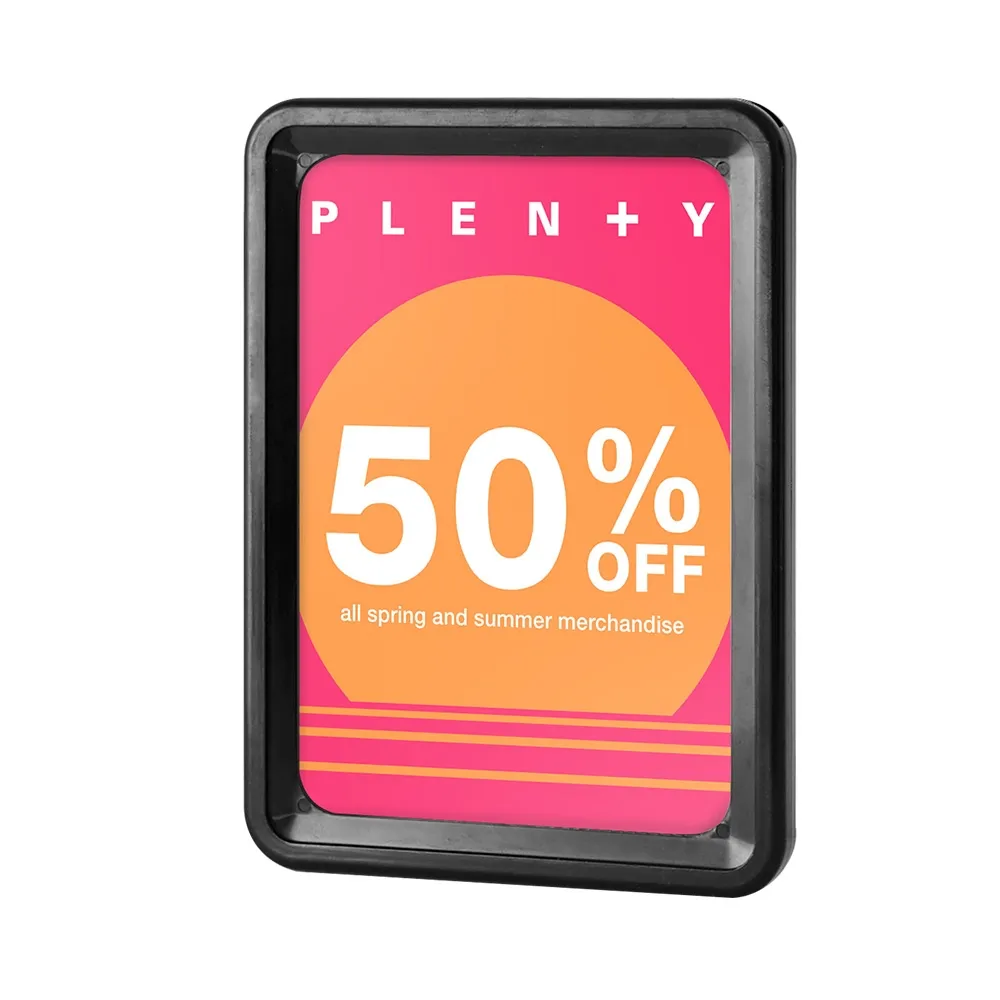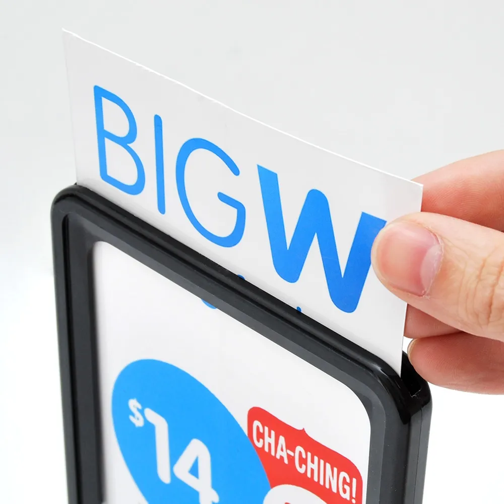 Black A6 signage is ideal for retail stores, tradeshows, grocery stores and more! Display your promotions, pricing, product information or events around your store with ease. This inexpensive display is double-sided allowing you to maximise exposure of your graphics without taking up additional floor space. Use this frame on its own or in conjunction with hooks or stands around your place of business. Your purchase includes 2 clear lenses that help to stop grime build-up and keep your display looking professional at all times.