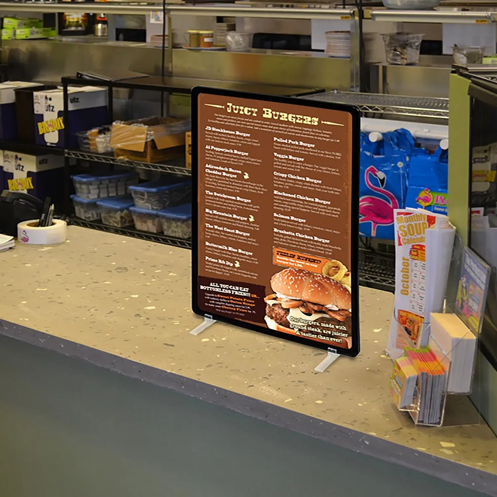 This retail price display, like a POP frame holder, makes advertising prices, important information, terms of service, and menus very easy in different locations. This inexpensive design is classic, and fits in with any décor with ease due to the three available colour options: black, blue, and red.