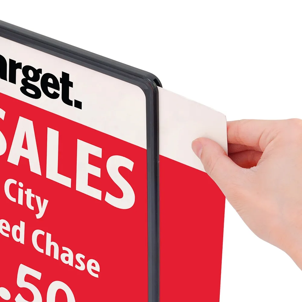 This point of sale sign holder has (2) clear lenses included that help maintain a professional looking display. Grime and dust are prevented from gathering on displayed graphics to keep them neat. Changing out posters is simple as well, as the slide-in design requires no tools for switching out your graphics!