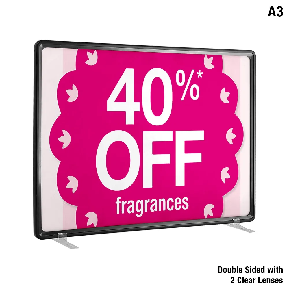 The POS sign, retail price display is meant to hold an A3 (420 x 297mm) graphic in either portrait or landscape orientation. The dual-sided display helps to promote in two directions at once, helping to reach out to more customers without taking up additional counter or floor space!