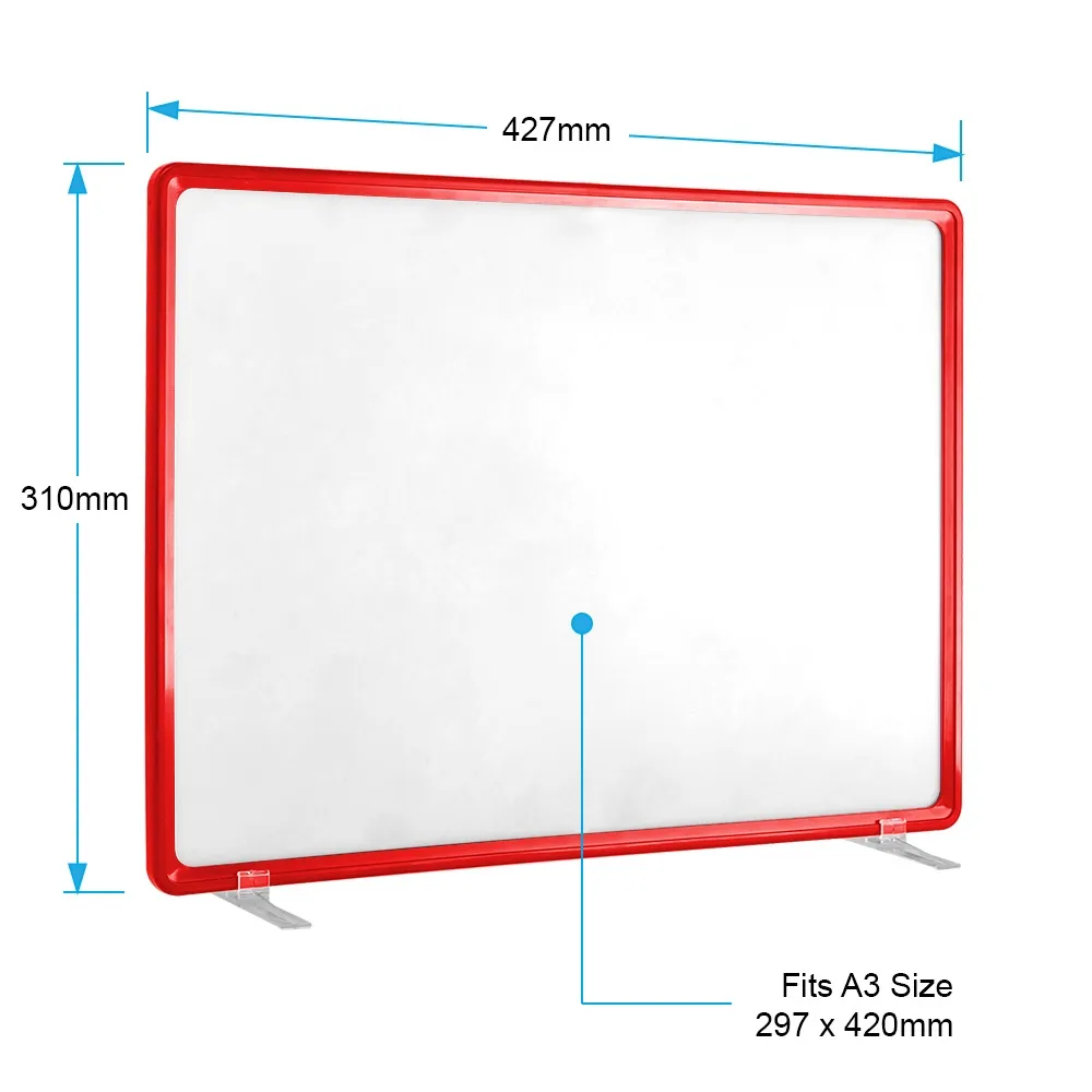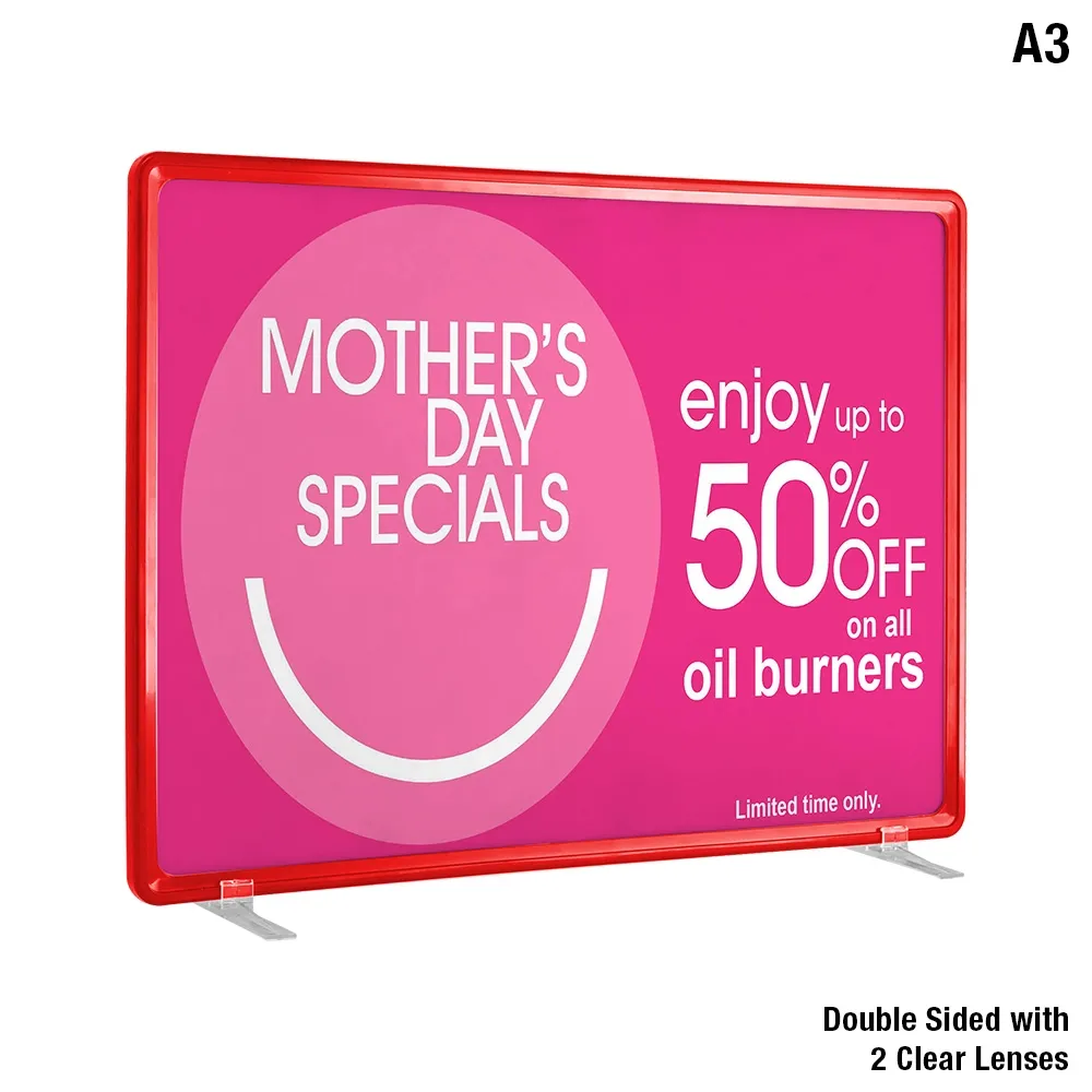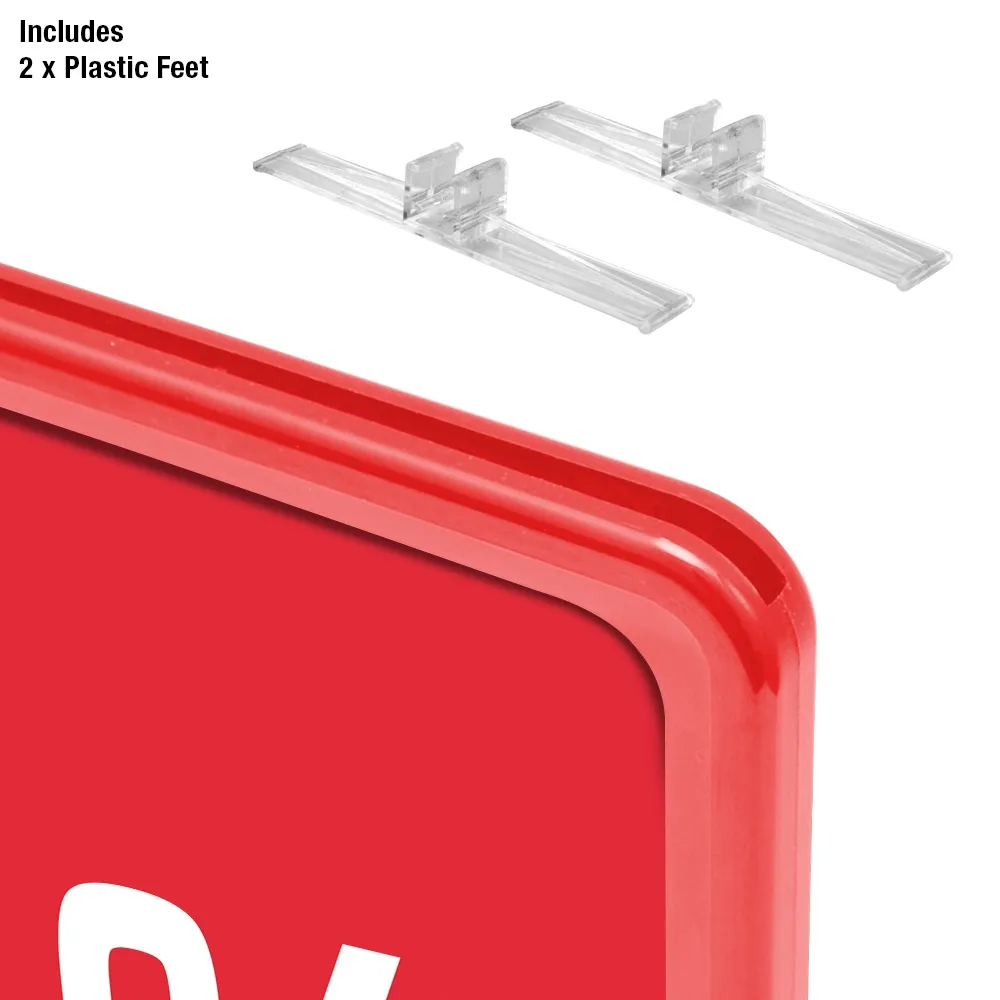 A3 price display in red for an eye-catching sign that makes advertising simple and easy. The free-standing sign comes with 2 clear plastic feet which can be attached to the frame. The detachable feet allow you to use the signage in portrait or landscape orientation. This inexpensive sign is a classic design that goes with any décor and is durable, perfect for a retail environment.