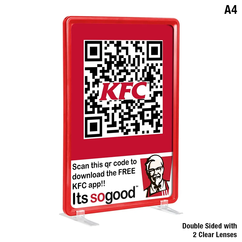 - A4 signage with red frame creates a durable and inexpensive display