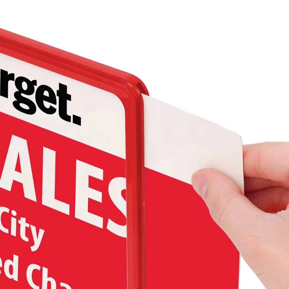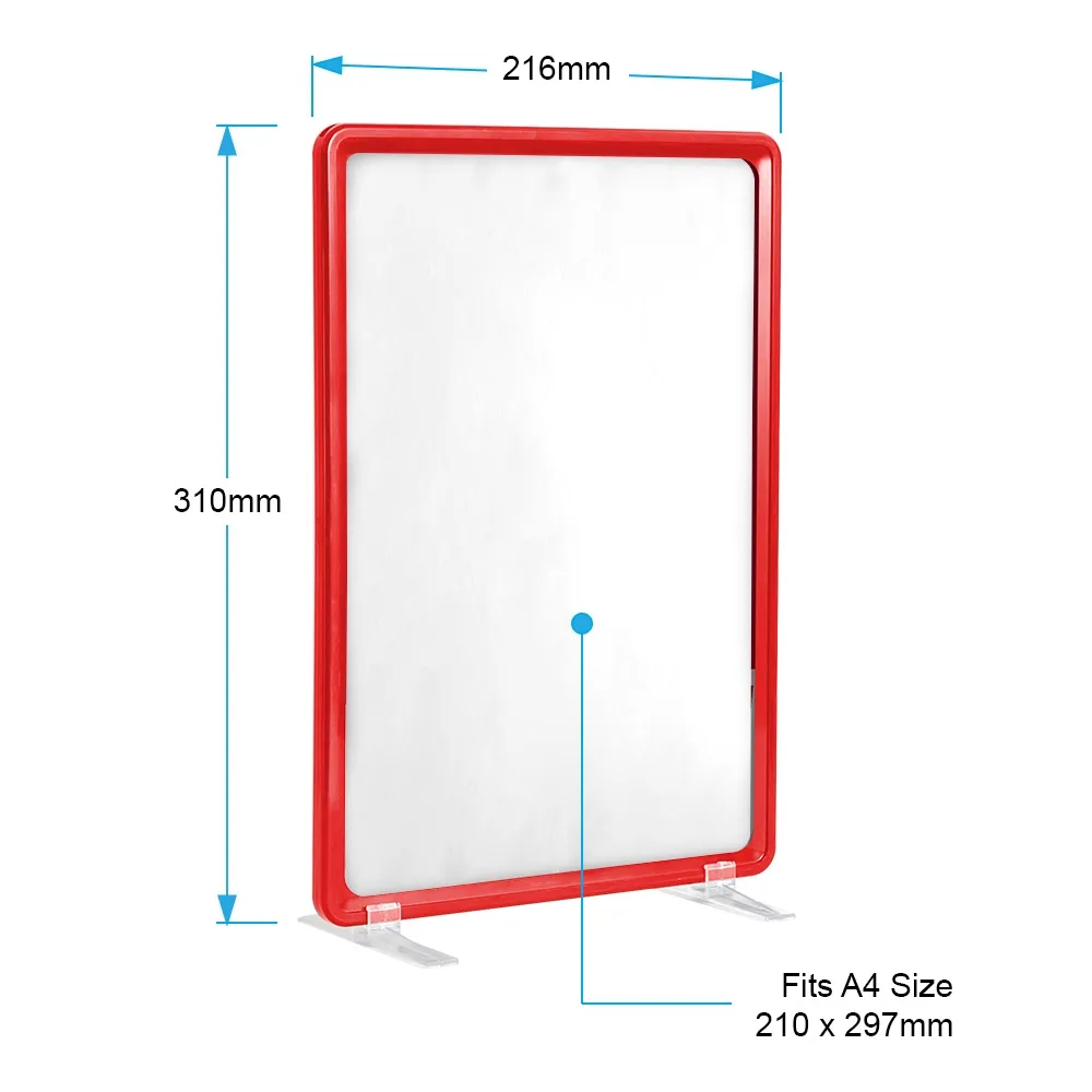 A4 signage with a red frame is made from durable plastic which creates a long lasting and inexpensive display. The A4 (297 x 210mm) graphics can be displayed in both portrait or landscape format and changed by simply sliding them in and out. This double-sided display maximises exposure to your audiences and gets your message out clearly, quickly and without fuss.