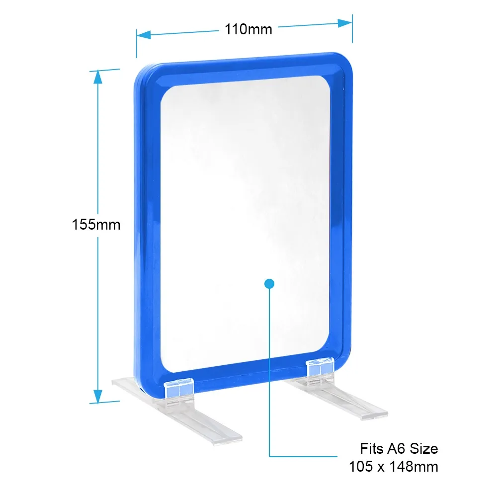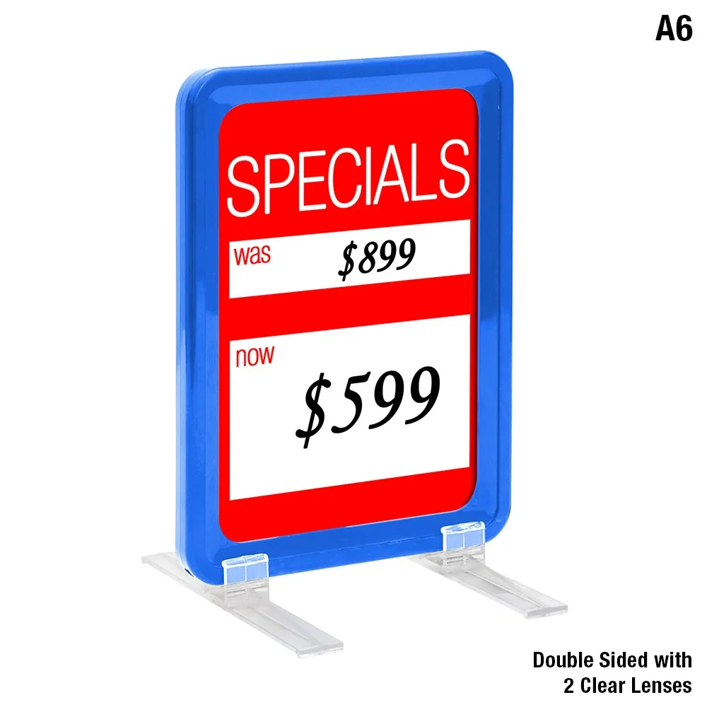 A6 blue POS sign can be used in landscape or portrait orientation with 148 x 105mm graphics. Easily change the graphic in and out with the slip in design. A clear lens is provided to help keep your display looking fresh and dust-free! Great for display pricing, warranty or menu information to customers anywhere in your store.