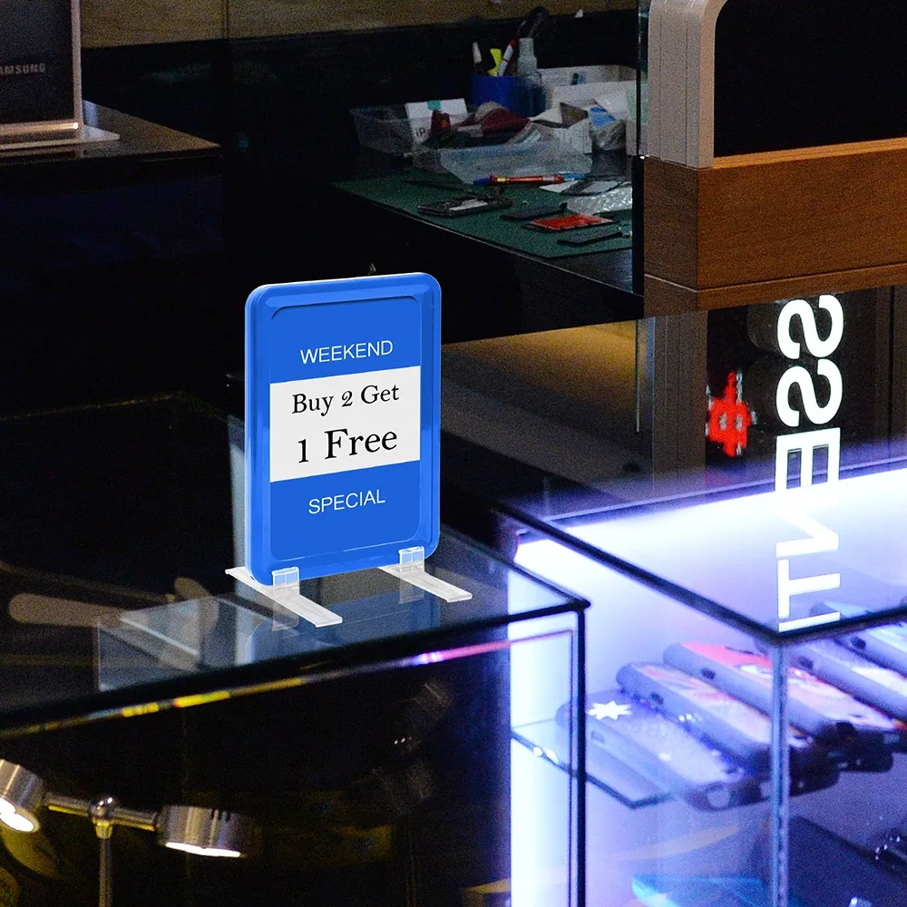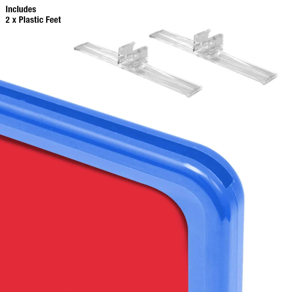 - Two plastic feet create a freestanding display