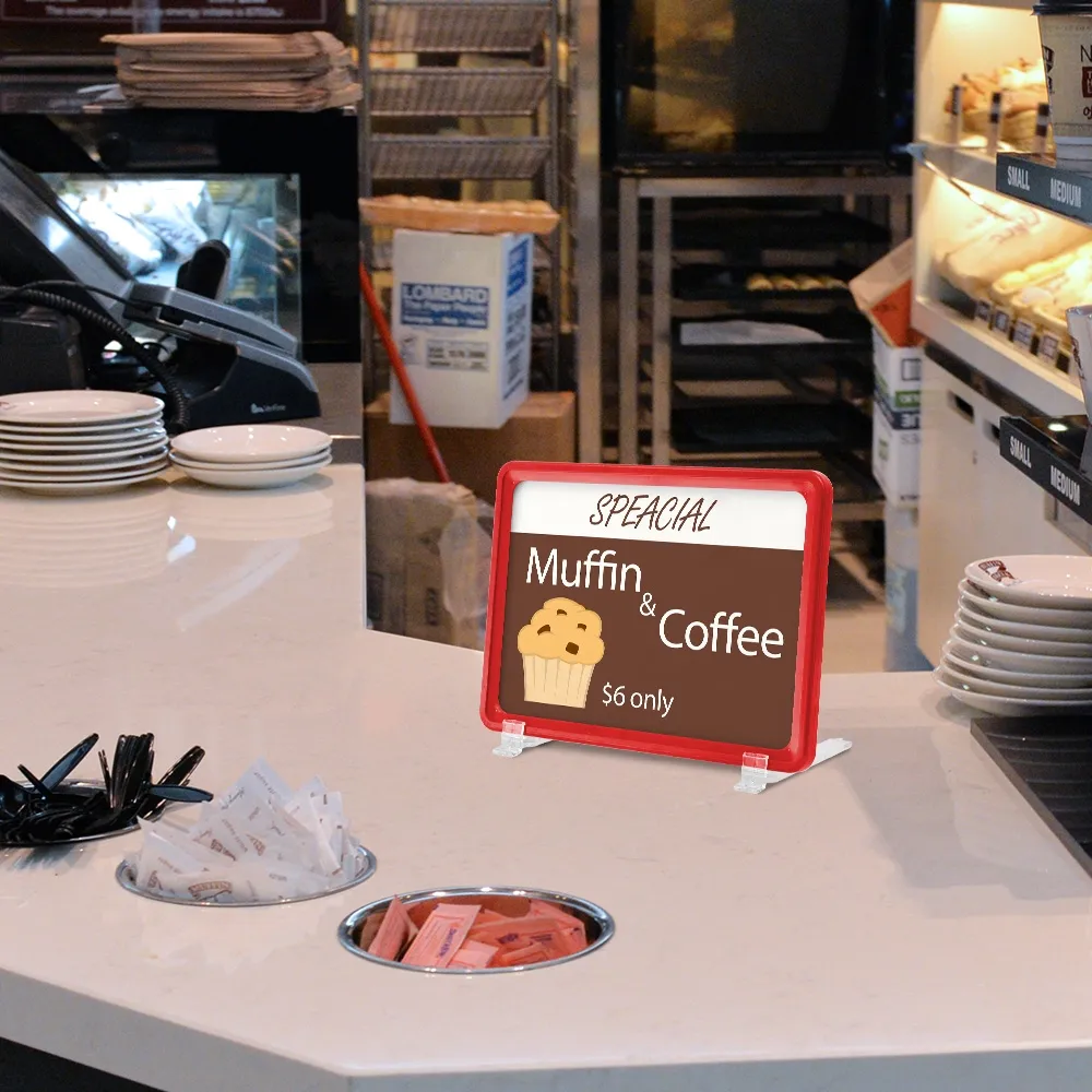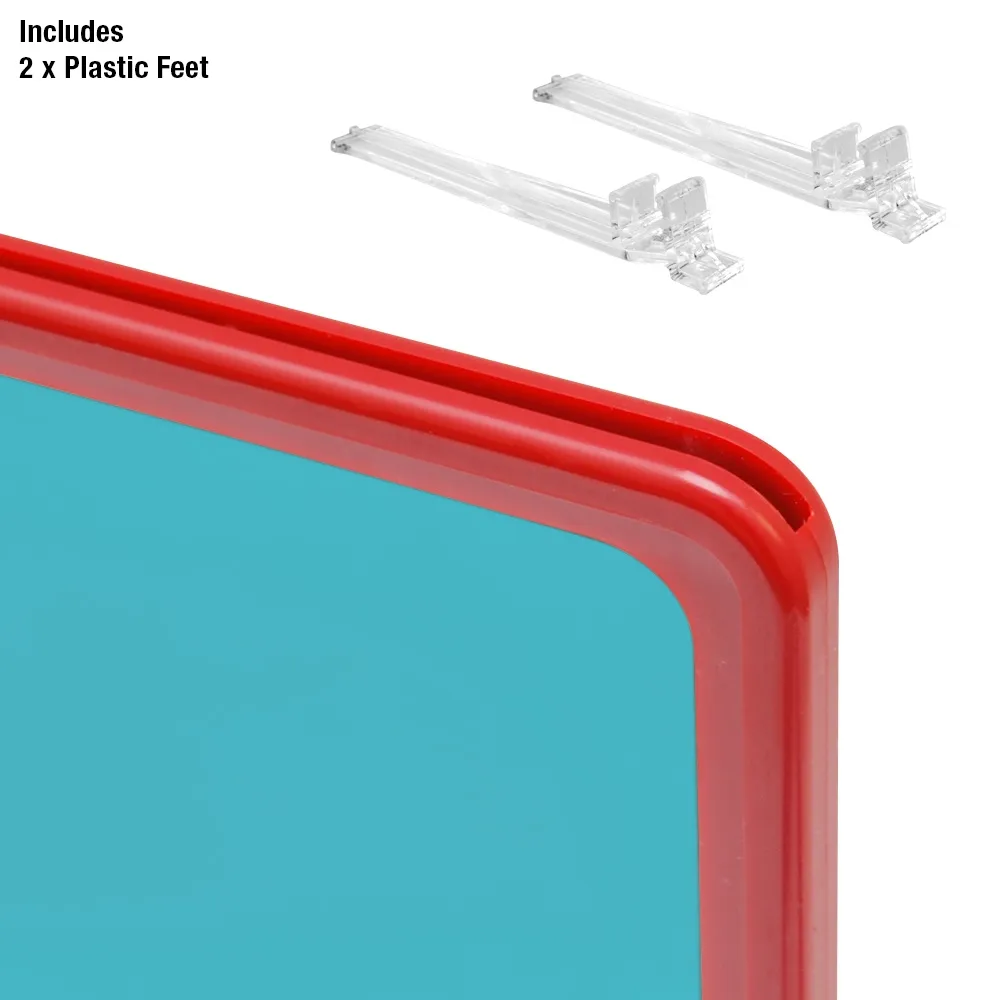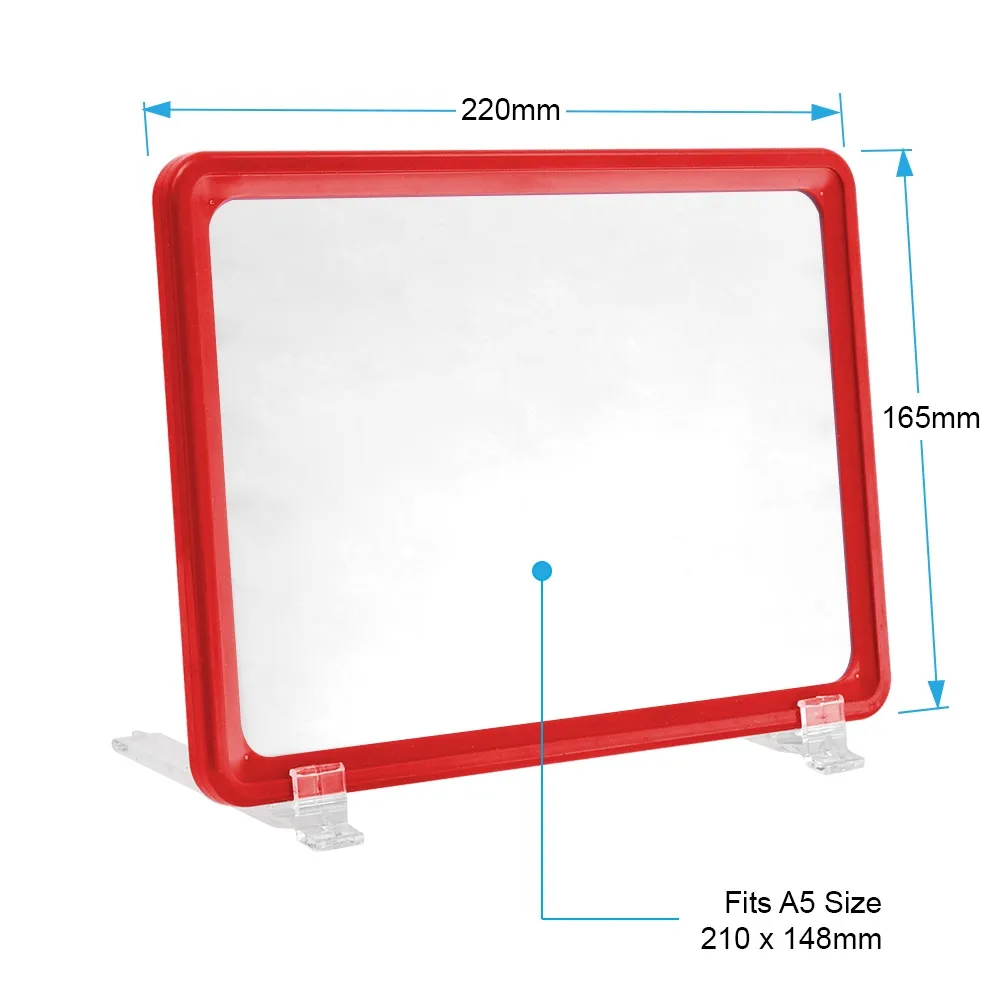- Red A5 tilted sign for easy reading has 2 plastic feet to hold frame in place