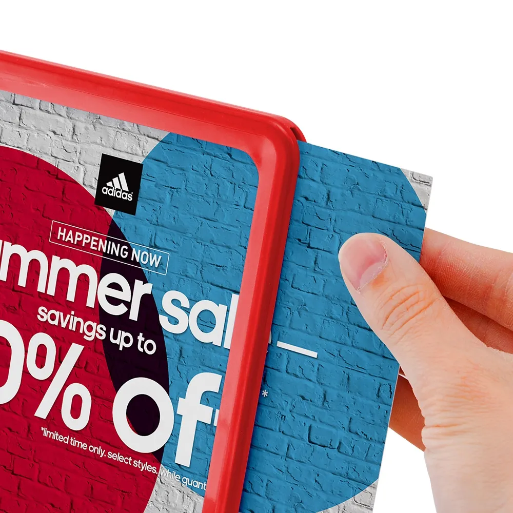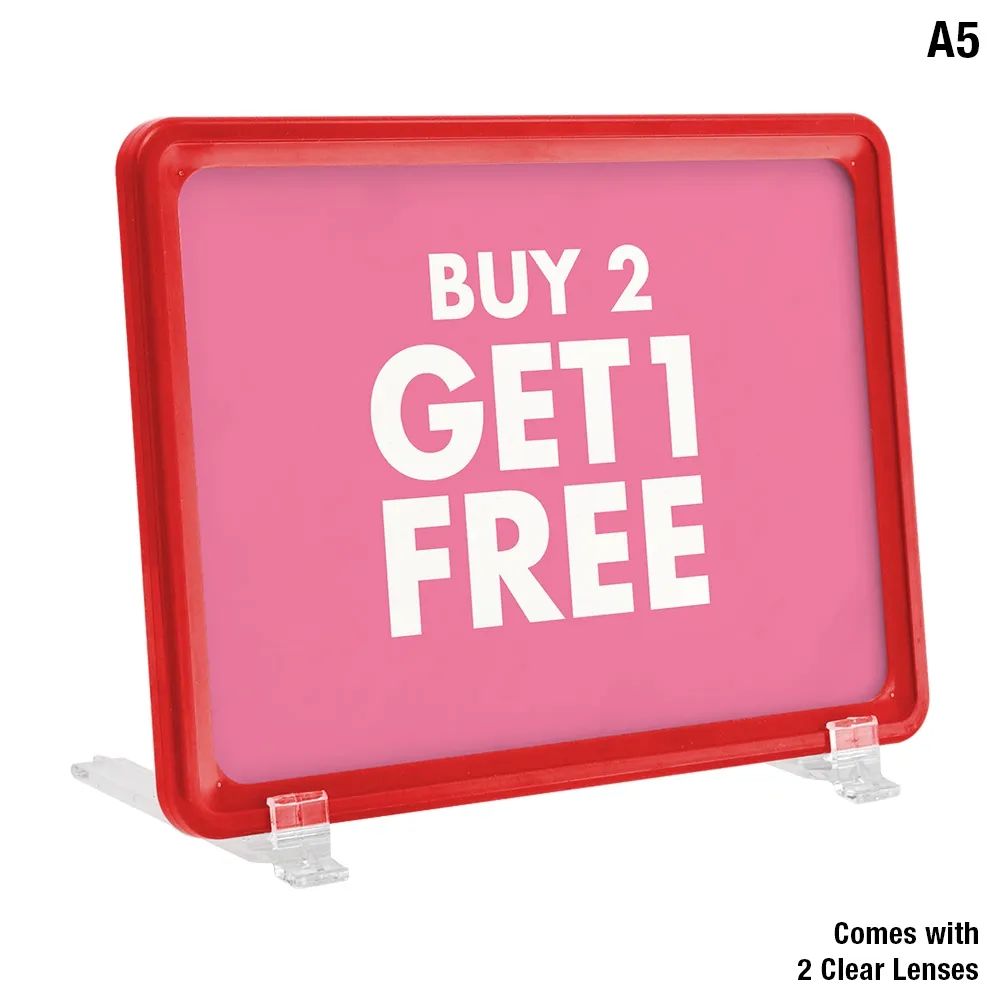 Red A5 tilted sign is designed to hold a 210 x 148mm graphic in either portrait or landscape orientation. The display is double sided allowing you to quickly switch between displayed graphics. The 2 plastic feet hold the frame in place and create an easy viewing angle for customers to read. These stands are a retail essential to display pricing, warranty information, promotions, product details and more!