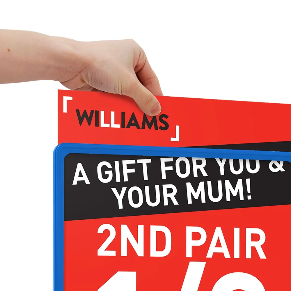 - Free standing POS sign comes with blue A3 frame that holds 420 x 297mm graphics