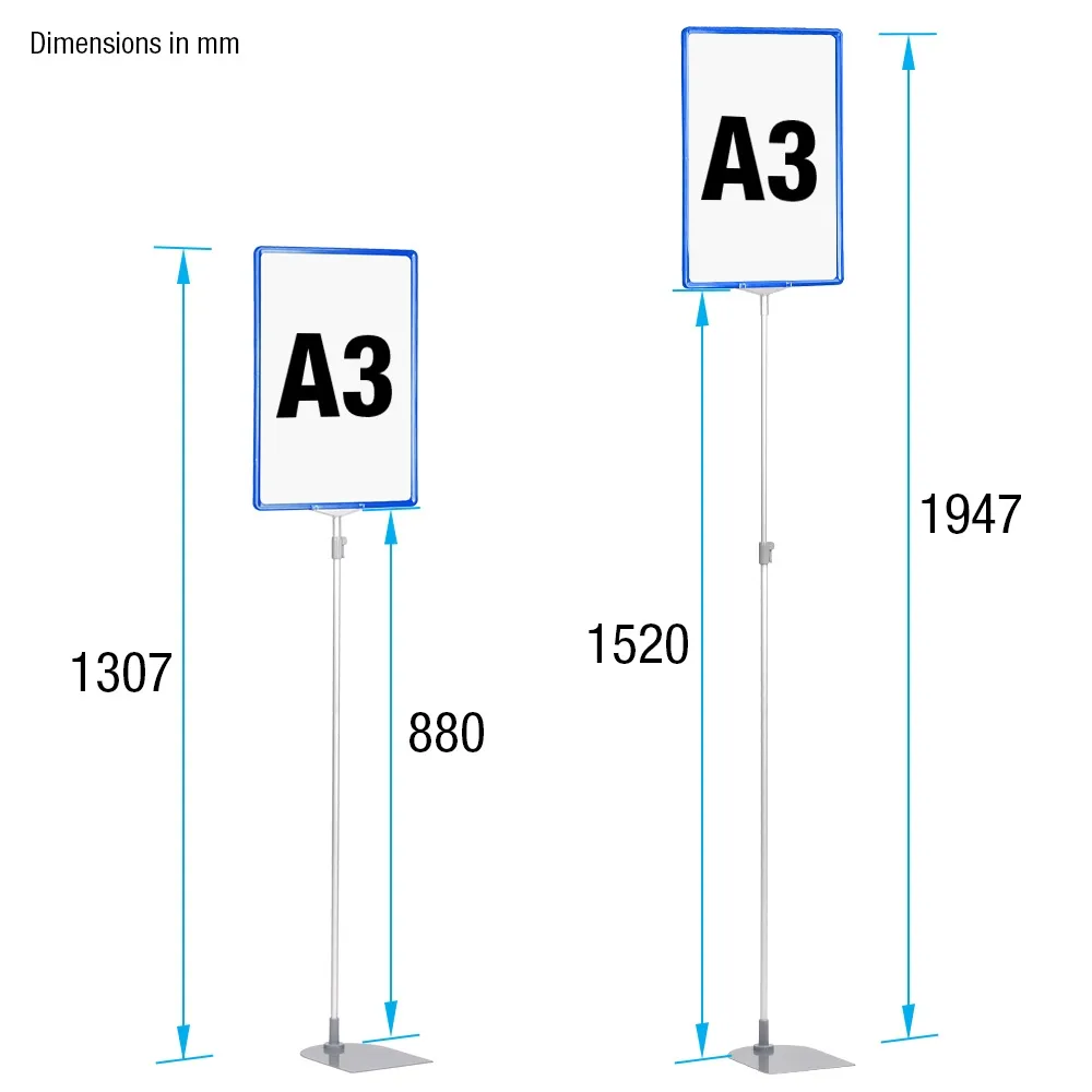 Free standing POS sign frame can be displayed in portrait or landscape orientation with the graphics easily changeable thanks to the slide in design. The telescopic pole can be adjusted from 1307 to 1947mm using the quick release latch, this also secures your desired height in place with the use of no additional tools! The metal base adds stability to your signage and can easily be slipped under floor stock. Place your order today before 2PM AEST and receive same day despatch from our Melbourne warehouse to anywhere in Australia!