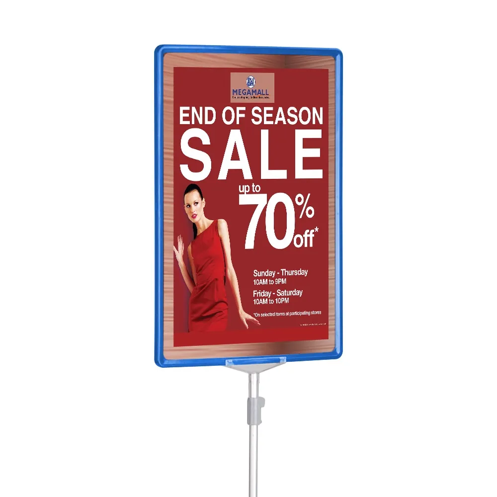 The adjustable height signage comes with a blue A3 frame that fits 420 x 297mm graphics in both portrait and landscape orientation to best fit your needs. The display is double sided to help maximise exposure from all angles and comes with 2 clear lenses to help keep your display dust-free and looking professional at all times! The graphics can also be switched out easily thanks to the slide in design. This convenient display is inexpensive and perfect for retail stores, supermarkets, hardware stores and more!