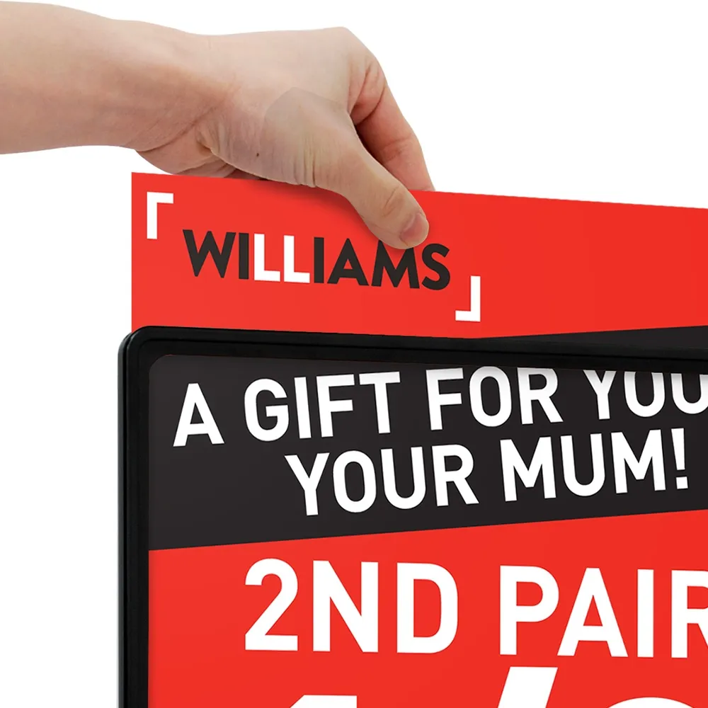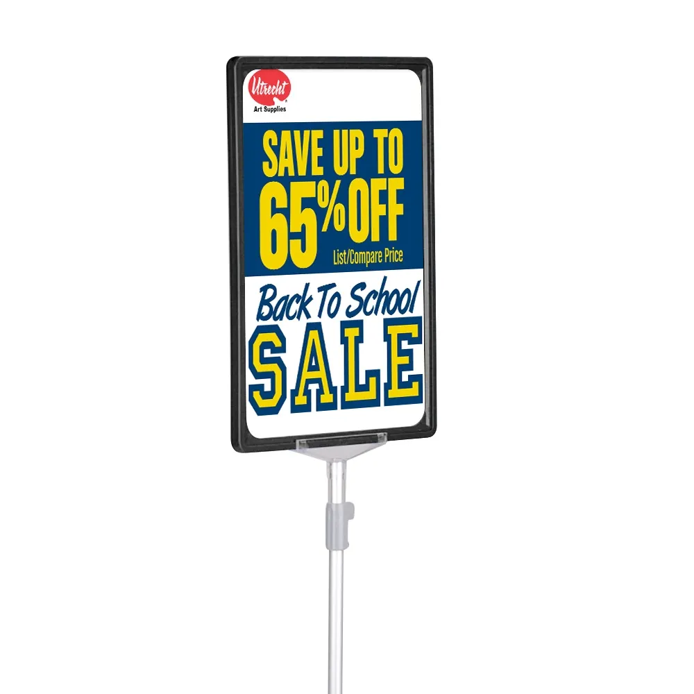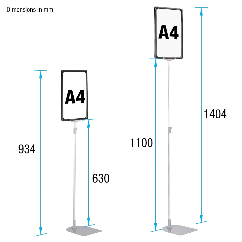 These showcard stand A4 are height-adjustable displays, allowing you to easily switch the height between 934 & 1404mm to best fit in with your display. The point of sale holder has a quick-release latch to make changing the height simple, and this latch securely holds the pole at the desired height once in position! This sign holds an A4 (297 x 210mm) graphic in portrait or landscape orientation to offer a versatile display. The slide-in design of the point of sale holders makes it an easy task to change out graphics in less than one minute with no tools required, perfect for fast-paced businesses!