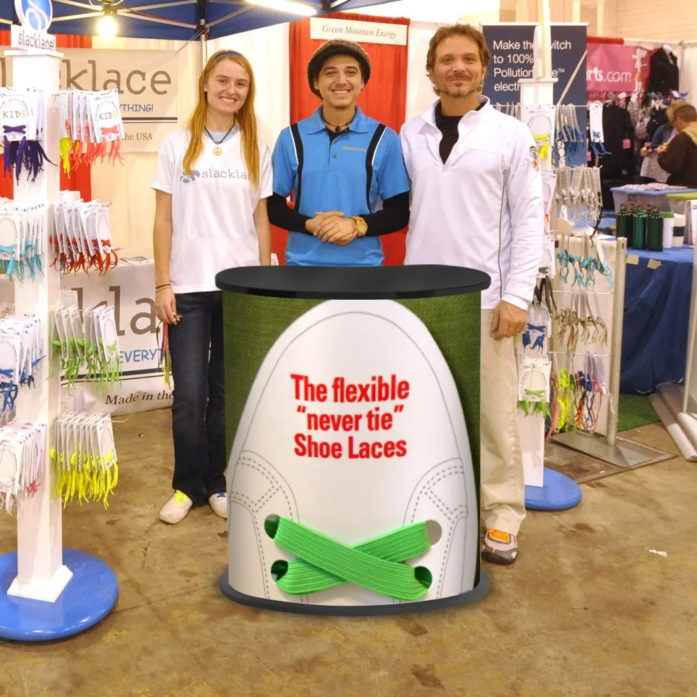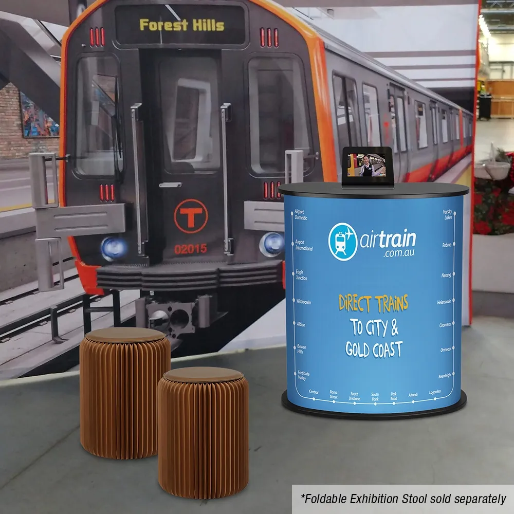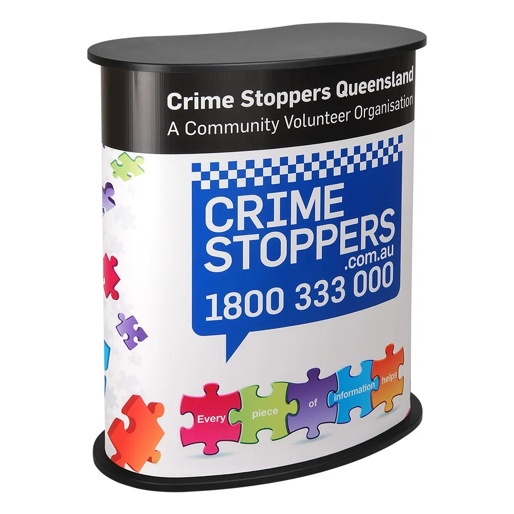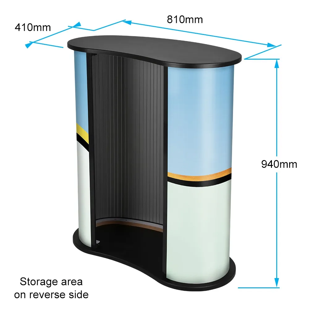 This particular portable counter features a curved shape onto which your graphics are applied by us, while the reverse side of the counter has an opening, providing you with storage space within the counter.