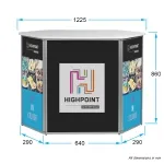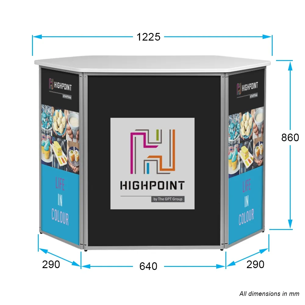 - Includes your graphics digitally printed with a matte laminate on the PVC panels of the portable counter