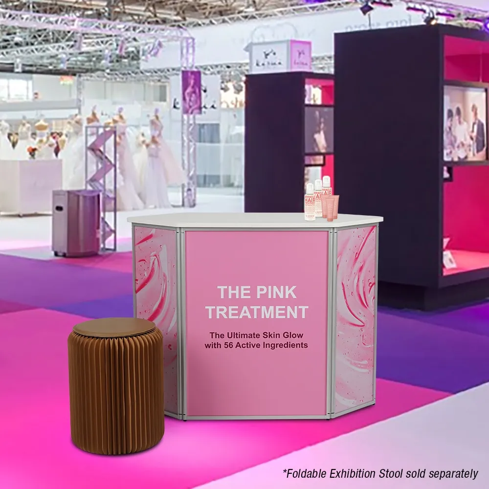 This display counter sets up in less than 1 minute without the need for any tools. Simply take the counter from the carry bag, open the side panels to form the hexagonal shape, fit the shelf support bars in both side ends and shelf panel and, finally, position the counter top in place.