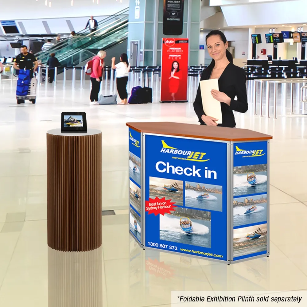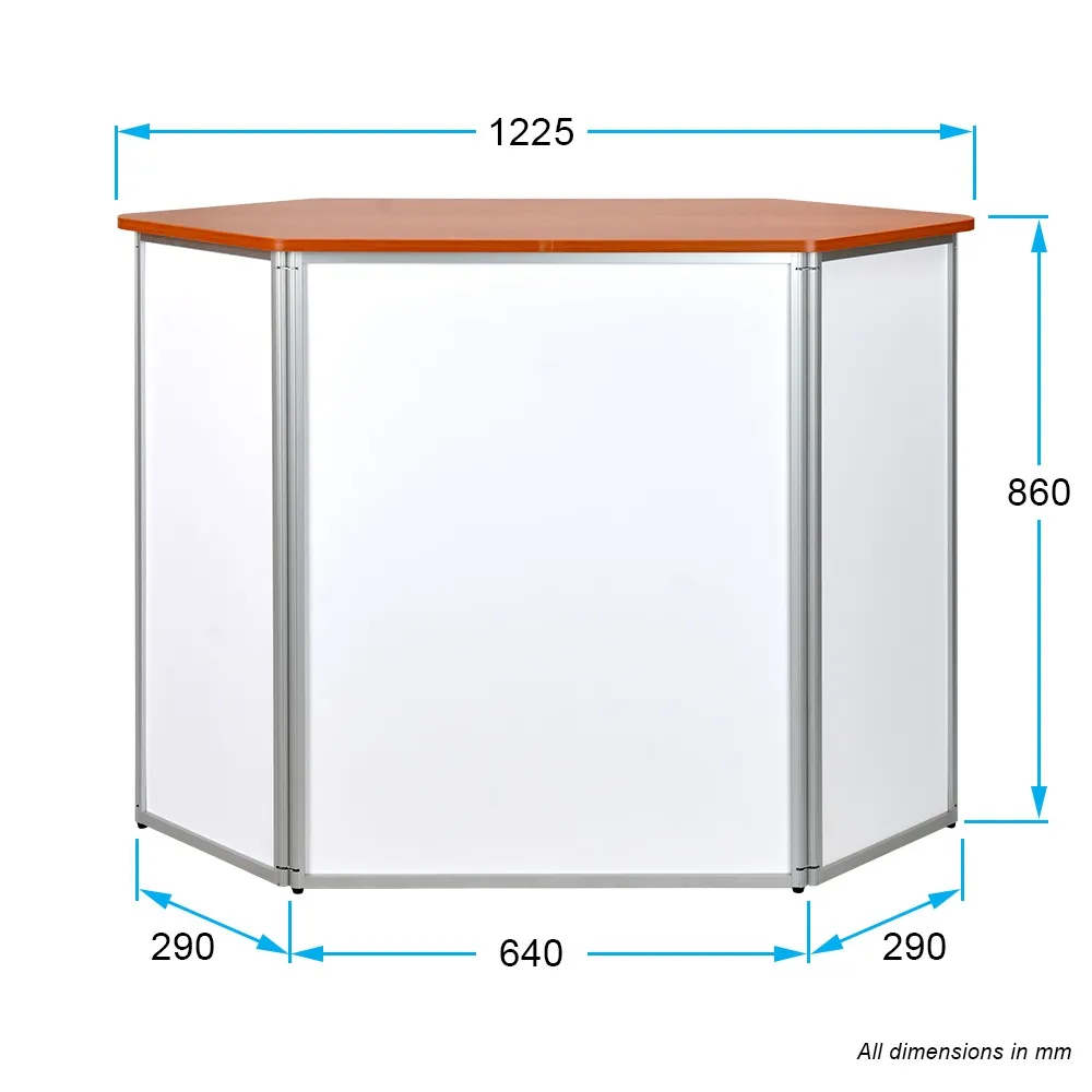 This pop up counter, promotional counter table helps you to display merchandise or promotional brochures and materials in any location, from exhibition halls and trade shows to shopping centres and retail stores. The exhibition display has a large 1225 x 550mm tabletop in a hexagonal shape that mimics the rest of the stand for a unique look. This tabletop is made from particle board with a wood finish laminate finish for a professional look at an affordable price. The countertop supports up to 60kg to easily hold the typical items used with this style of display.