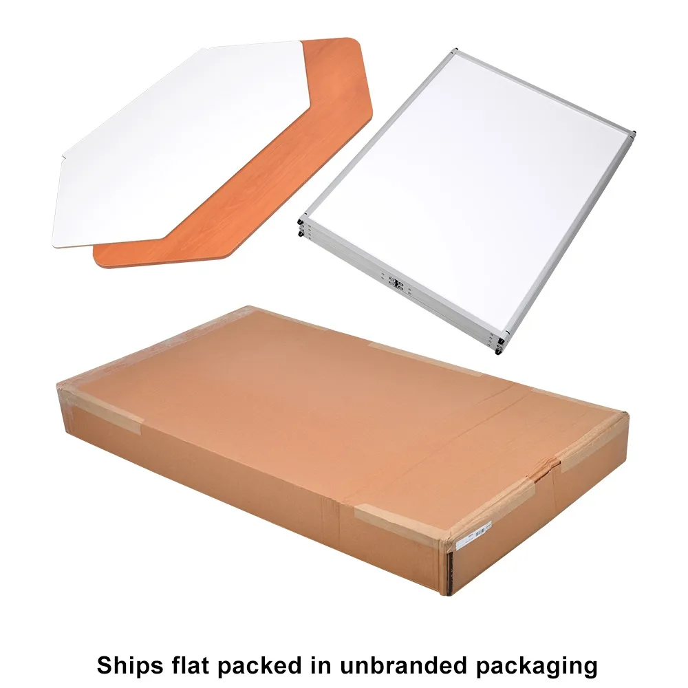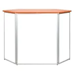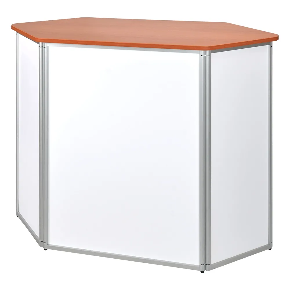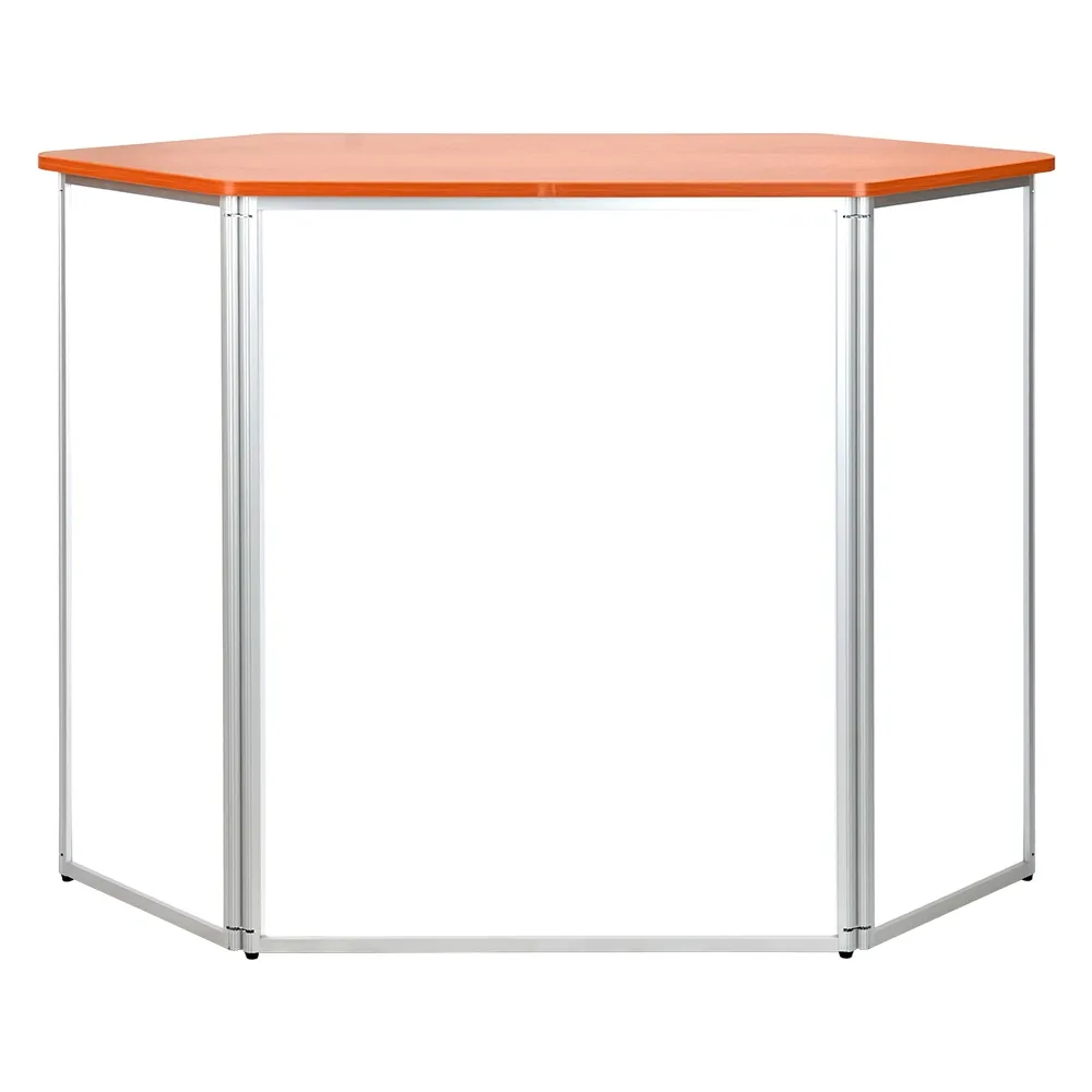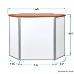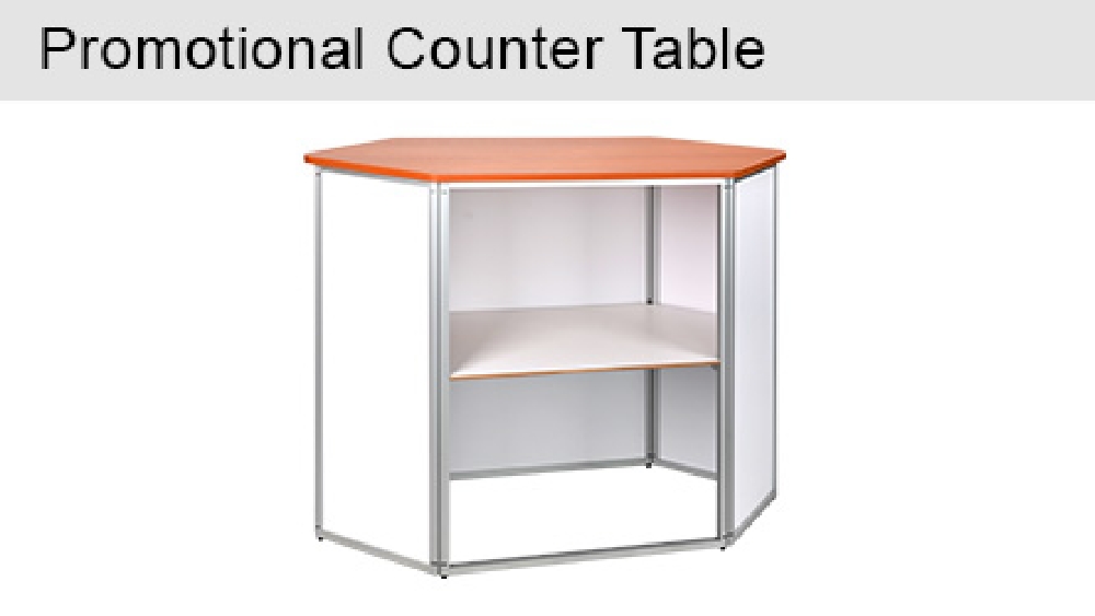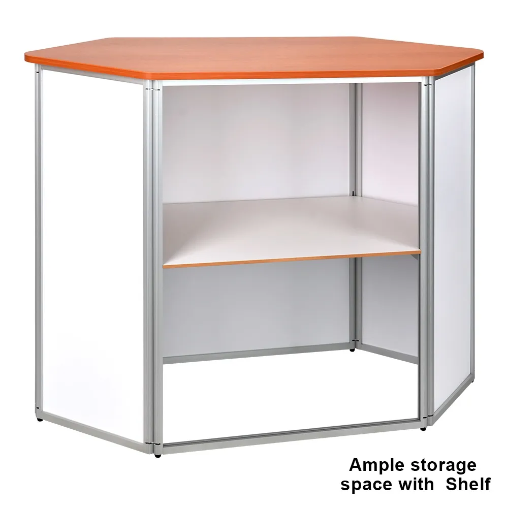 The trade show counter with storage is made from extruded aluminium with 3mm thick matte white PVC panels making up the sides. The exhibition promotion table has a large 1250 x 550mm countertop to provide heaps of space for your items, with a total support weight of up to 60kg. This stand has a unique hexagonal shape that includes the countertop for an eye-catching look. The table top is made from particle board with a wood finish laminate for a stylish look that works well with any design.